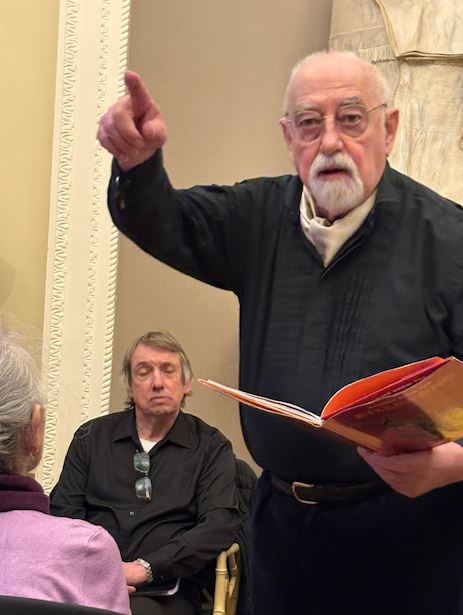 The venue took Poetry Performance away from its usual haunt upstairs at The Adelaide, “the Queen of pubs”, in Teddington where it meets on the first Sunday of every month, into the public’s view, in an exposition of pieces scripted and compiled by Anne Warrington, who directed the performance, with the support of Kenneth Mason.