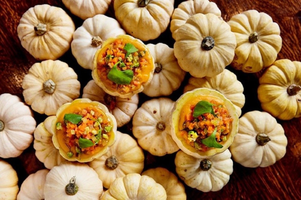 This leads us back to the first question. What to do with the middle bit. Pumpkin must be one of the most versatile of vegetables. It can make sweet or savoury goodies, pumpkin soup or pumpkin jam, pumpkin pie or pumpkin puree pasties; even pumpkin hummus. Eat a pumpkin chip and you won’t go back to potato chips with your battered cod. For the sine qua non there is Michelin-starred chef Pascal Aussignac’s Jack-be-Little pumpkin barigoule.