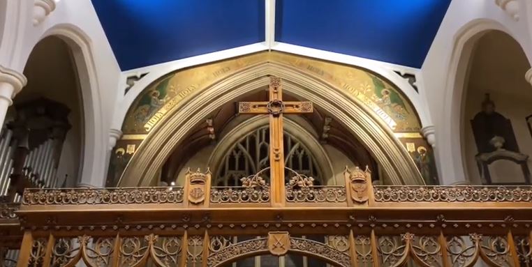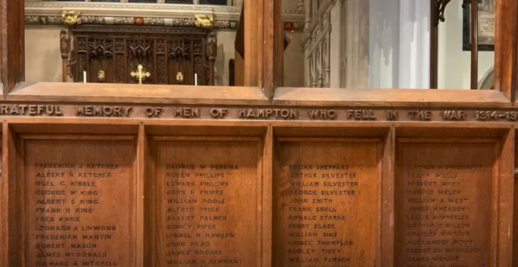 This short recital recording does also reveal for the first time publically the beautifully restored church, built in 1829-31 on previous medieval foundations by architect Edward Lapridge, whose other works also include St Paul’s Hammersmith (long since dwarfed by the A4 flyover) and Kingston Bridge. The restoration has bought out the resplendent blue of the nave and choir ceiling, believed to be the original Georgian colour. Especially remarkable though is the gilded mural above the chancel arch, with angels praising God, “Holy, Holy, Holy”, long lost under numerous decades of grime. Nevertheless the most pertinent feature relevant to remembrance, and seen in some detail in the video, is the intricately carved oak choir screen erected a century ago as the memorial to the men of Hampton lost in the Great War, to which a quarter century later were added those lost in the Second World War. All their names are carved in the oak. If the stories of all these brave men were brought together, what a fascinating tome that would be.