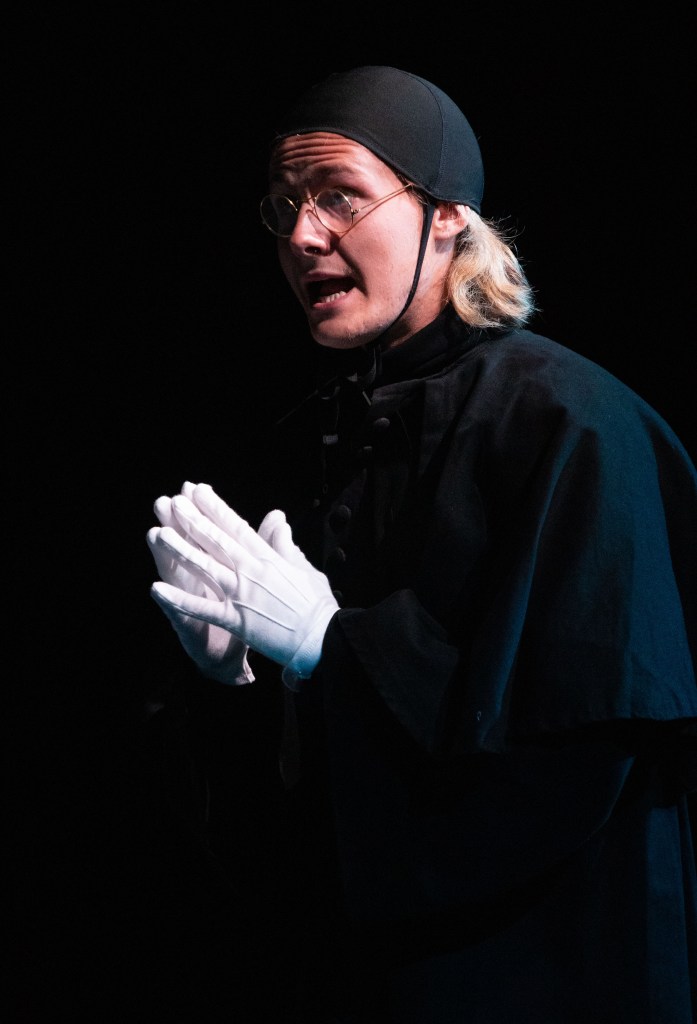 The atmospheric lighting worked with the black and white pulling the whole together, with as you may expect, a large amount of darkness and light with the well-placed brightness on specific actors rather than continual changing background lighting (or that is how it appeared to audience benefit). An unwanted distraction with a single, superfluous white box projection drew away eyes that wanted to remain on the cast and which were frustratingly not rewarded. Well-chosen music completed an effective collaboration.