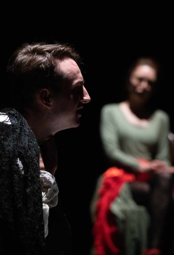Of the minimal props, there are pillows in the opening minutes but their contrasting softness is of little or no comfort, whether on which to lay a tormented head or clutch to a body, and they cannot reach a soul. A holey umbrella and later, bodkin (of course), enhance. Metal pails, floppy, clothed dolls and water give us an intriguing (and shocking) conceptual portrayal, and of equal visual and psychological effect, is the running use of colour; notably black, white and splashes of red, with all their connotations, and the eye being attracted, not distracted, by one predominantly green costume. There are other nice touches for what would be traditional key moments but not to give too much away.