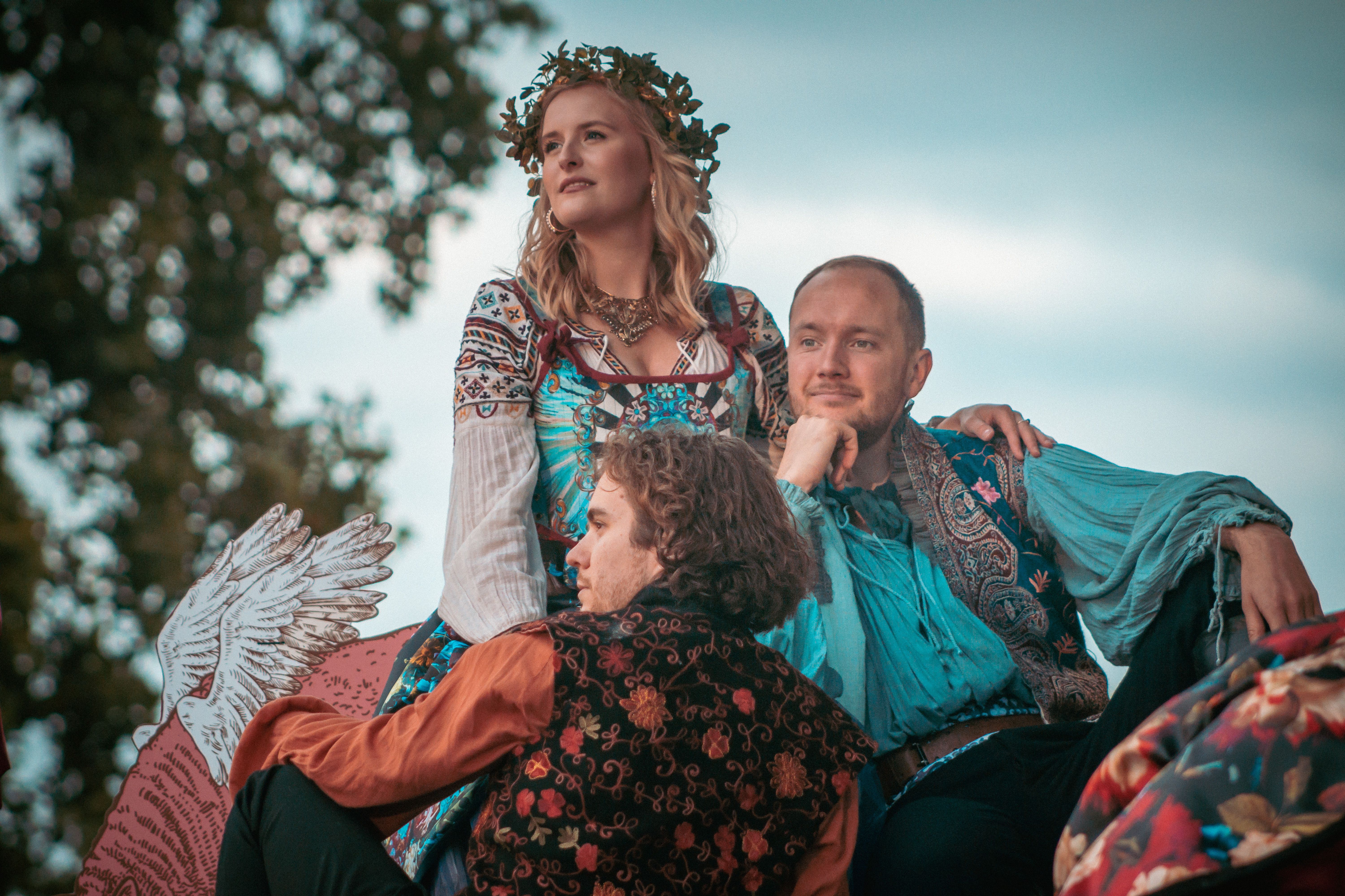 Origami birds are just one of many clever devices that Designer, Laura Jane Stanfield uses to compensate for the necessary absence of a set in this open-air production. Another is the use of props, often symbolic and occasionally tongue-in-cheek and self-deprecating. When Acis enters seeking his love, for example, he carries a pocket sextant (although perhaps a little too small though to be seen at the back of the audience).