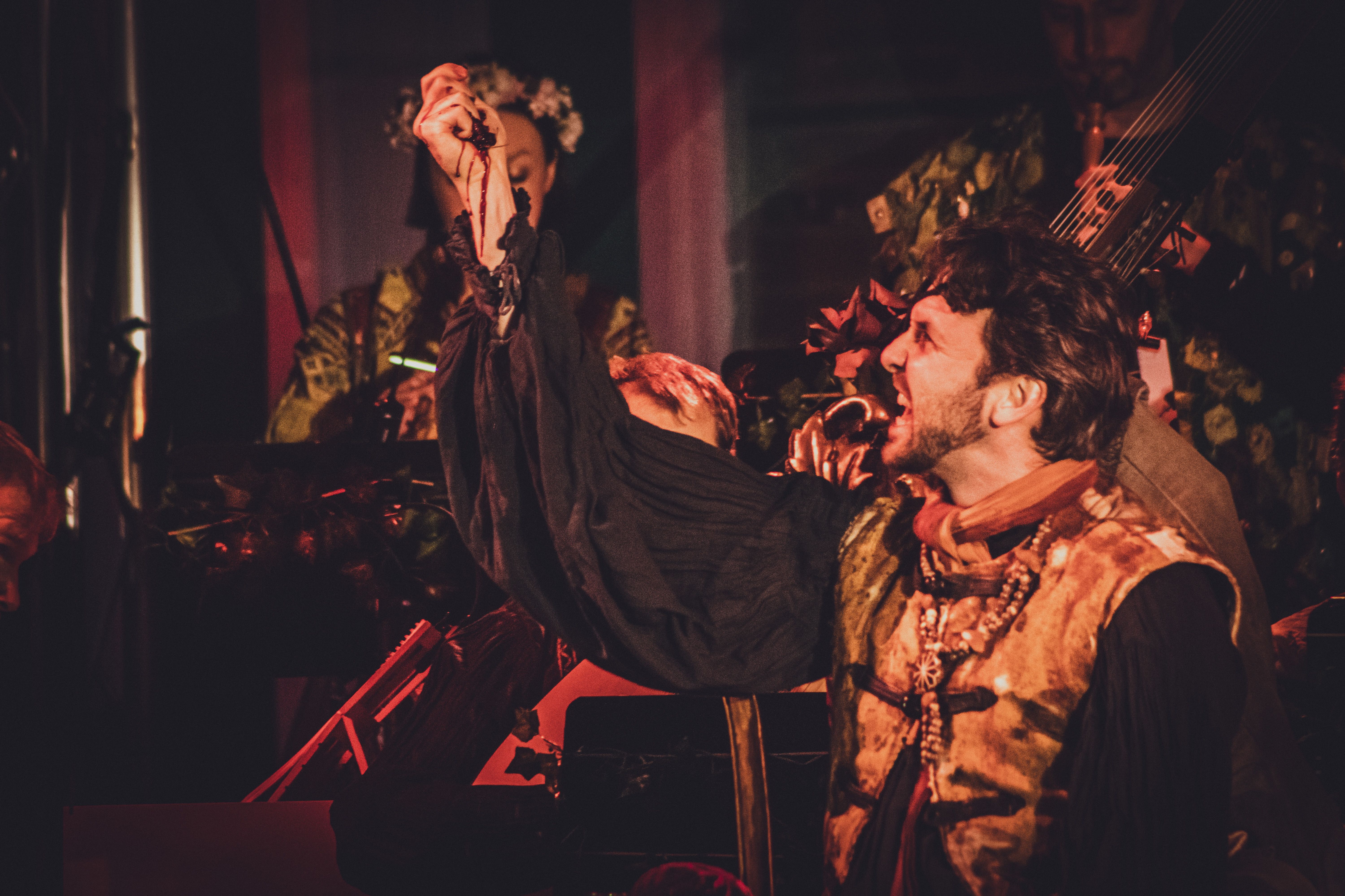This is quite a puff for the entrance of Polyphemus, a monstrous one-eyed goliath. However in this role, Tristan Hambleton rises to the part, a snarling, jealousy-ridden ogre, crashing his way around with a heavy staff and a heavy hand. The role has to be played big, in the drama sense, and Hambleton could have taken it even bigger, but wisely measured his portrayal with gestures, crushing the “blood” from cherries, and with his ample bass-baritone voice. With the musical accompaniments Handel mocks Polyphemus, furioso strings as he fumes, “I rage, I melt, I burn!” and a sopranino recorder against “O ruddier than the cherry”. The musicians have great fun with this. Hambleton is a little more comfortable towards the top of his range, but here this works in making Polyphemus’ outbursts more of a rant.