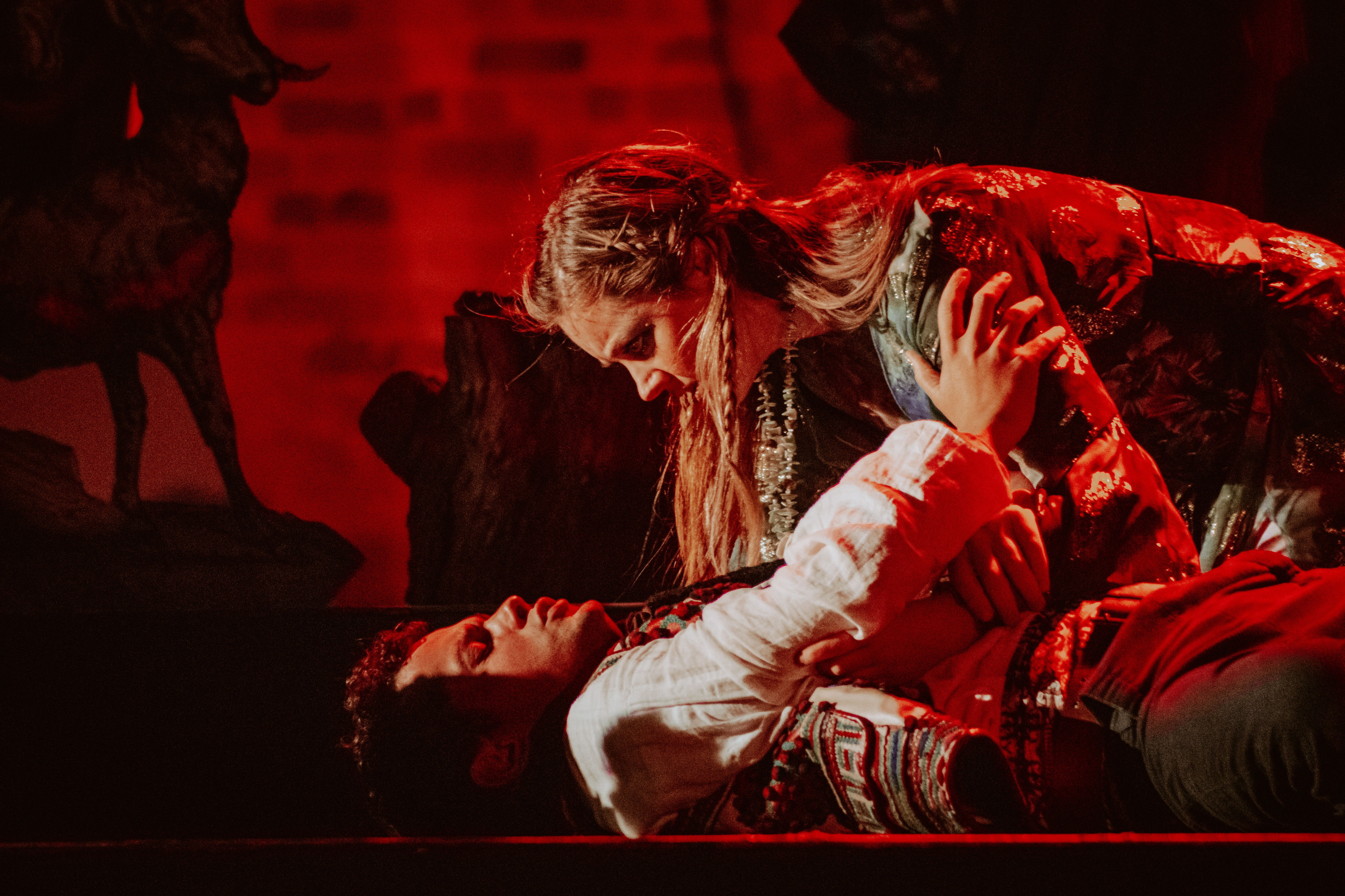 Polyphemus is arrogant and vain. In one of many finely details references, Director, Sophie Gilpin has him preening himself before a mirror imagining himself the hero, but an image of Acis looks back. Polyphemus rages because he fancies Galatea and feels thwarted by Acis. The “cherry” is Galatea. To say that Polyphemus is a clumsy suitor is an understatement: Galatea appears after their first encounter with a bloody nose and split lip.