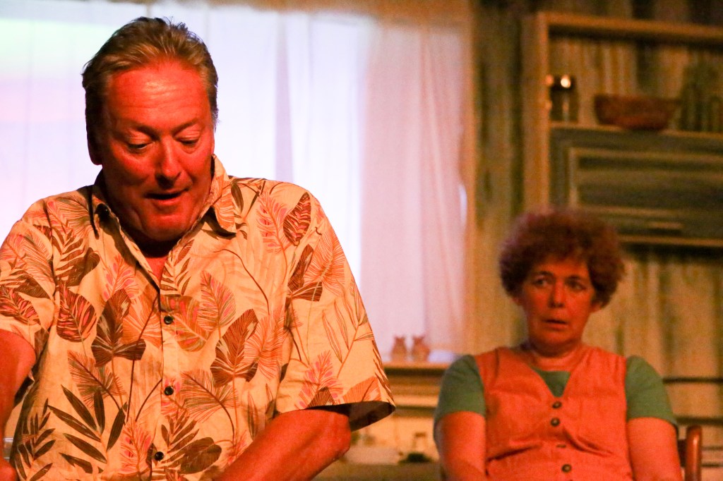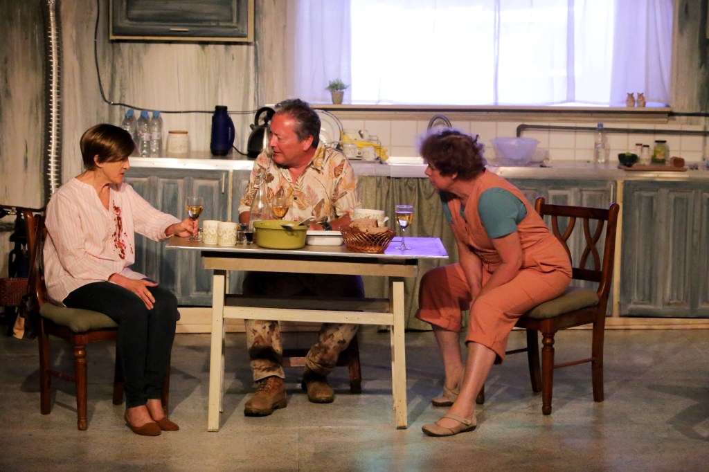 The play, directed by Michelle Hood, is set in the kitchen cum dining room of a remote cottage on the coast, with the kitchen area set along the back wall, having a central window overlooking an effective view of the sea and a rocky promontory holding back surging waves. The whole area is rather ramshackle, in keeping with the story that unfolds.