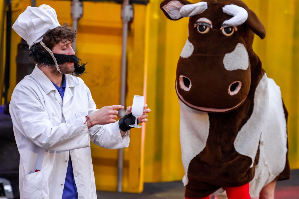 The show continues much along these lines, alternating between tightly-scripted, apparently-improvised, and actually-improvised, and switching between them easily. The material’s delivery comes over as unhurried, and the performers seem to be having just as much fun as the audience. And the audience are having a great time. Some of the material is unsophisticated, whether the performers are “milking” a pantomime cow, or attempting to pull down each other’s underwear, but it’s all delivered with such playful energy, and alongside one-liners like “Newton went scrumping for gravity” that the audience remain firmly on side throughout.