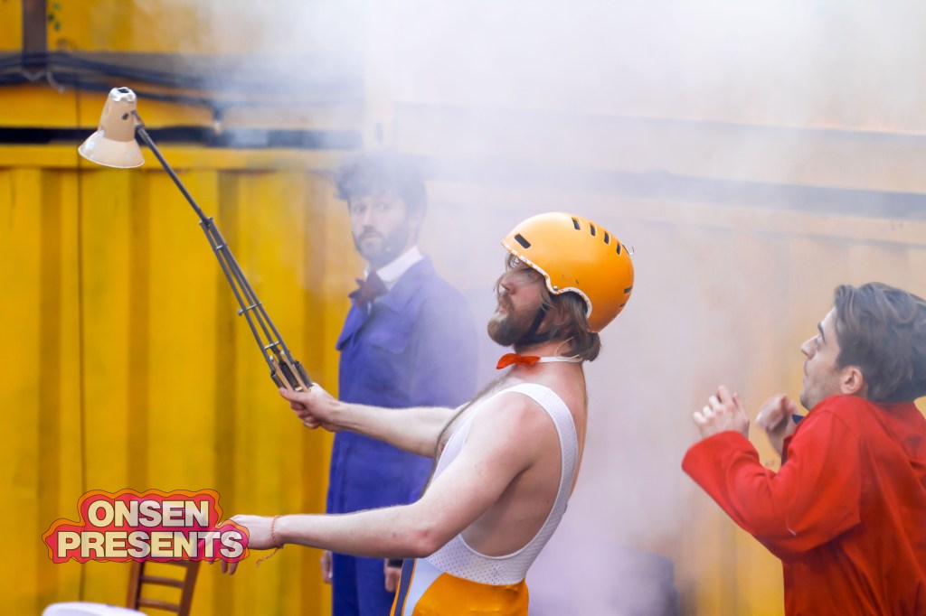 From the moment the tent revolves to reveal all three performers cramped inside, it’s clear that we’re in for an enjoyable evening of spirited physical comedy. While the performers all begin the show dressed in primary-coloured jumpsuits, they are quickly shedding costumes and knocking themselves unconscious left, right and centre.