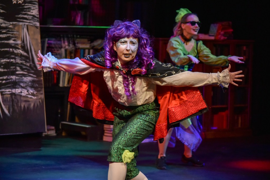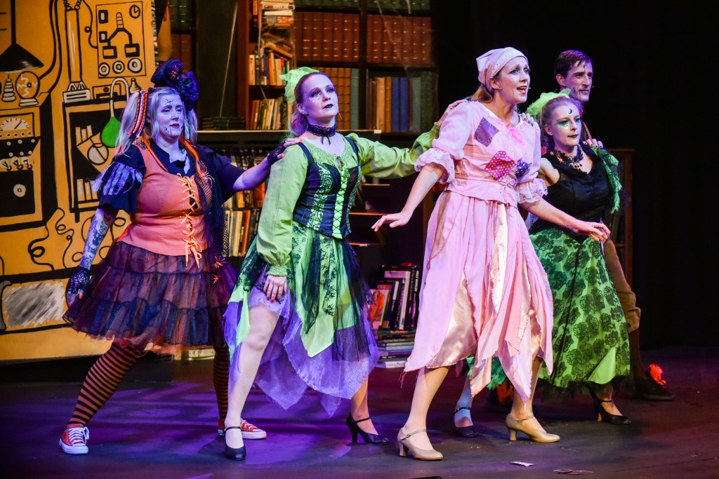 No need for clunky scenery changes, thanks to a neat trick by set designer Fiona Auty for her backdrop of a giant book, whose pages were turned to transport us speedily scene to scene: from the lab of Cinders’ father Frank Enstein (amiably played by Matt Ludbrook) a troubled scientist cursed by his wife, the Wicked Witch, to a creepy forest haunted by ghosts and ghouls; from the step sisters’ boudoir to the venue for the Rocky Horror Show-themed ball.