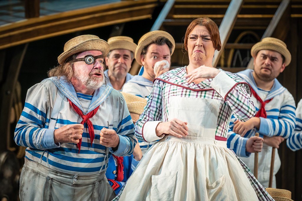 After the electrifying overture conducted by Chris Hopkins, the stage was opened up to a stunning ship set, designed by Takis, a prolific stage and costume designer. Sharply detailed, we enjoyed the timeless We shall sail the ocean blue, before the plot really unwound with the bumboat woman, Little Buttercup, an earthy and enticing woman, coming on board. While she pedalled her wares, Buttercup hinted at a dark secret …