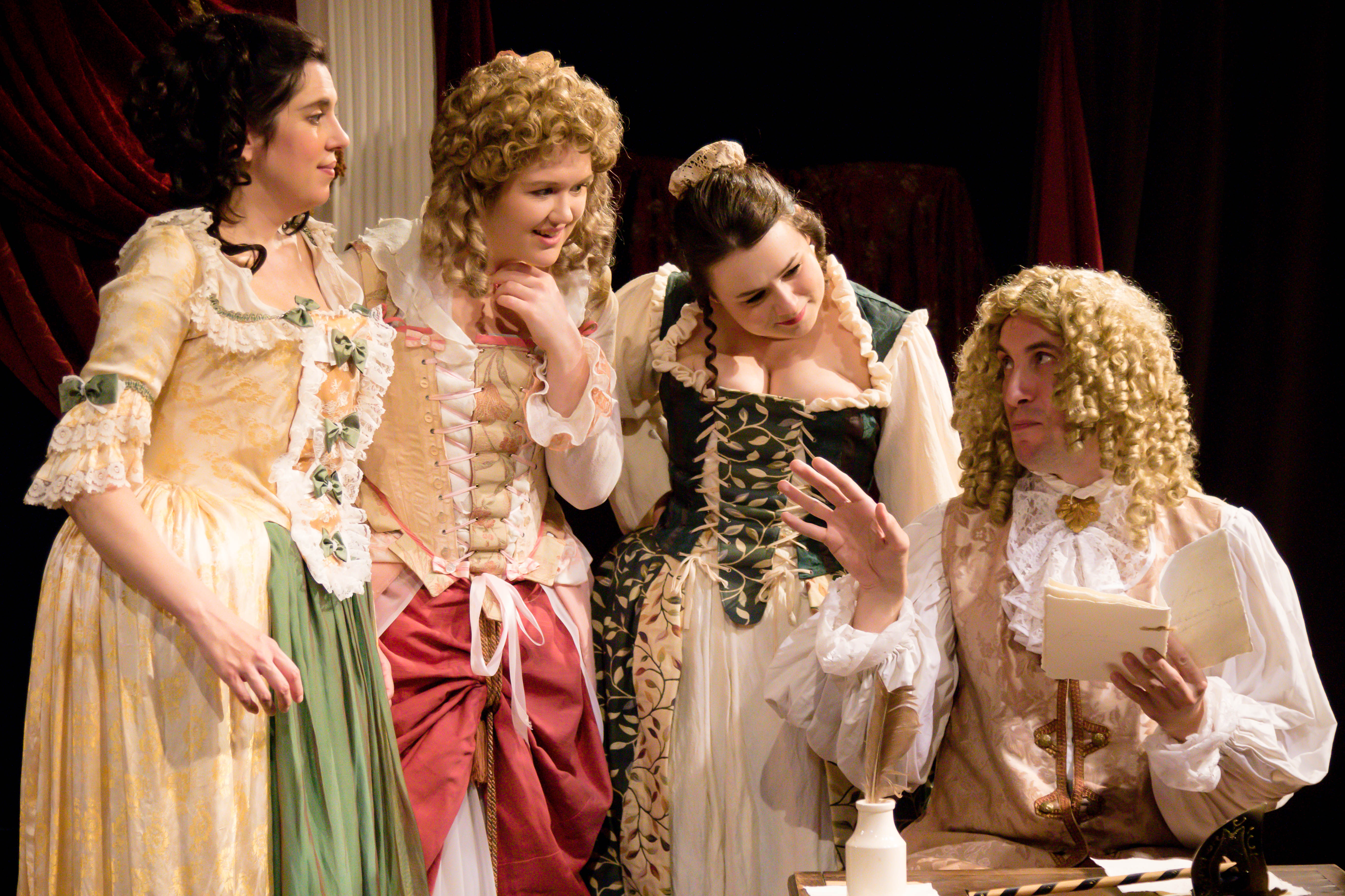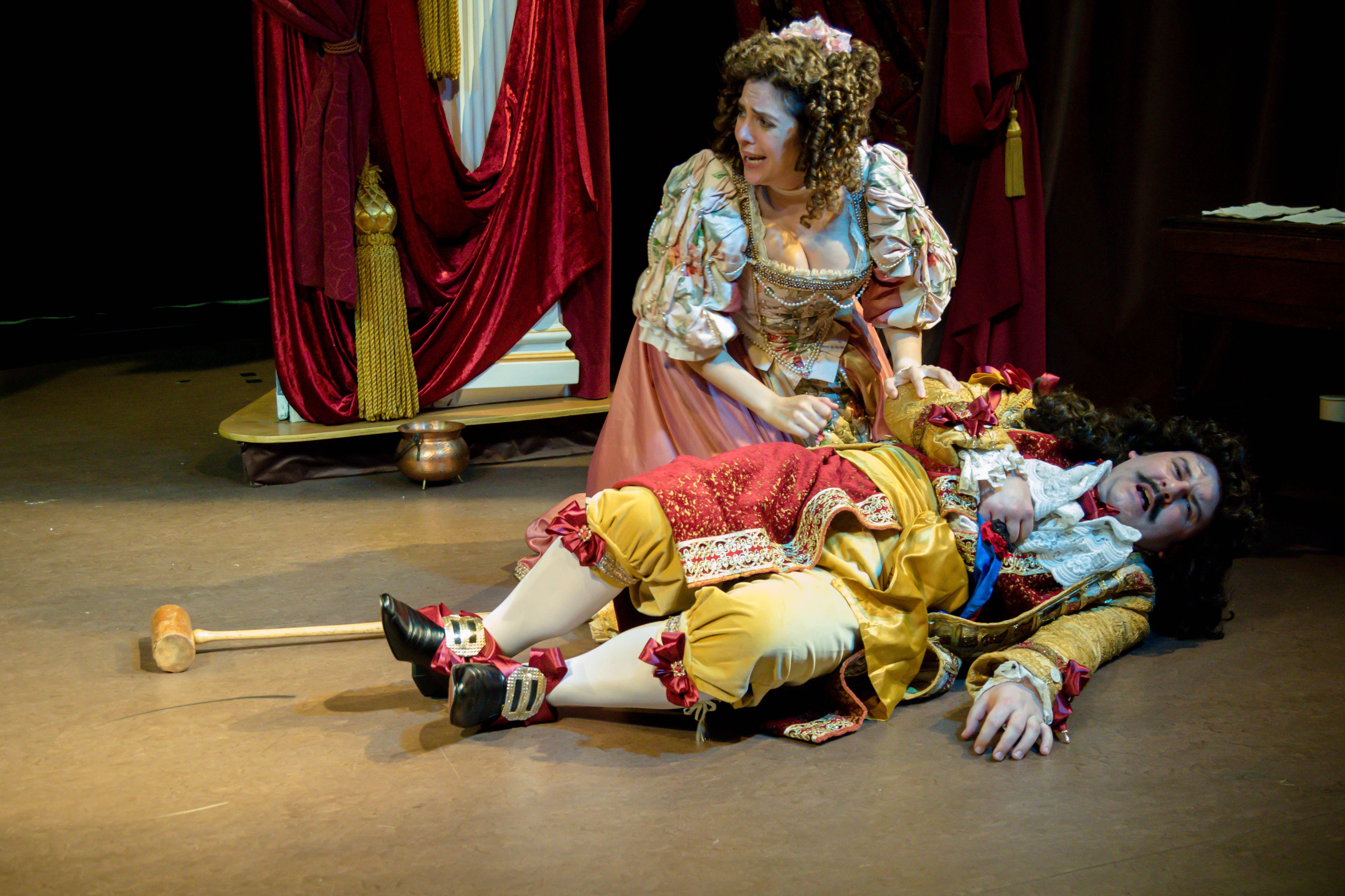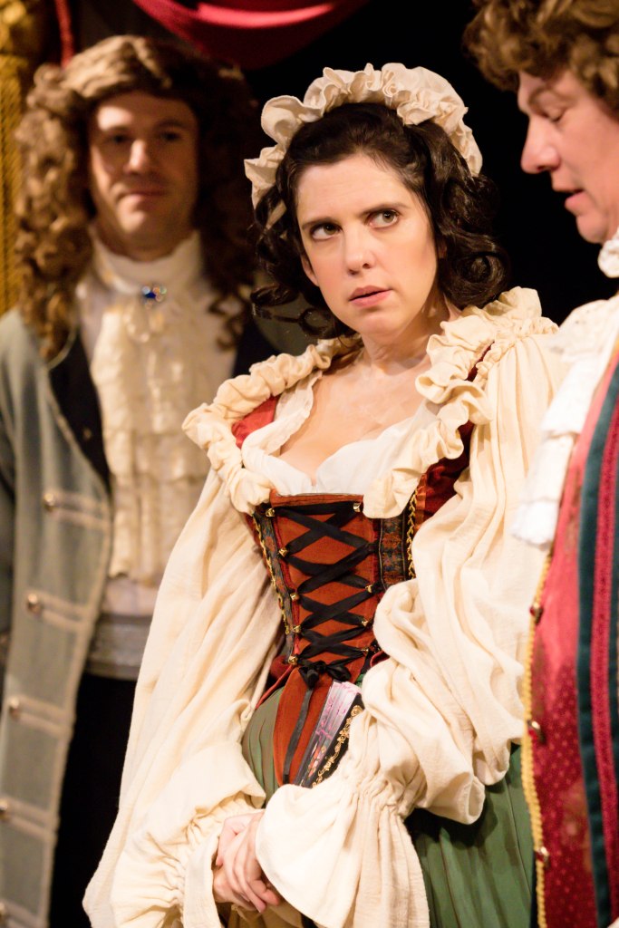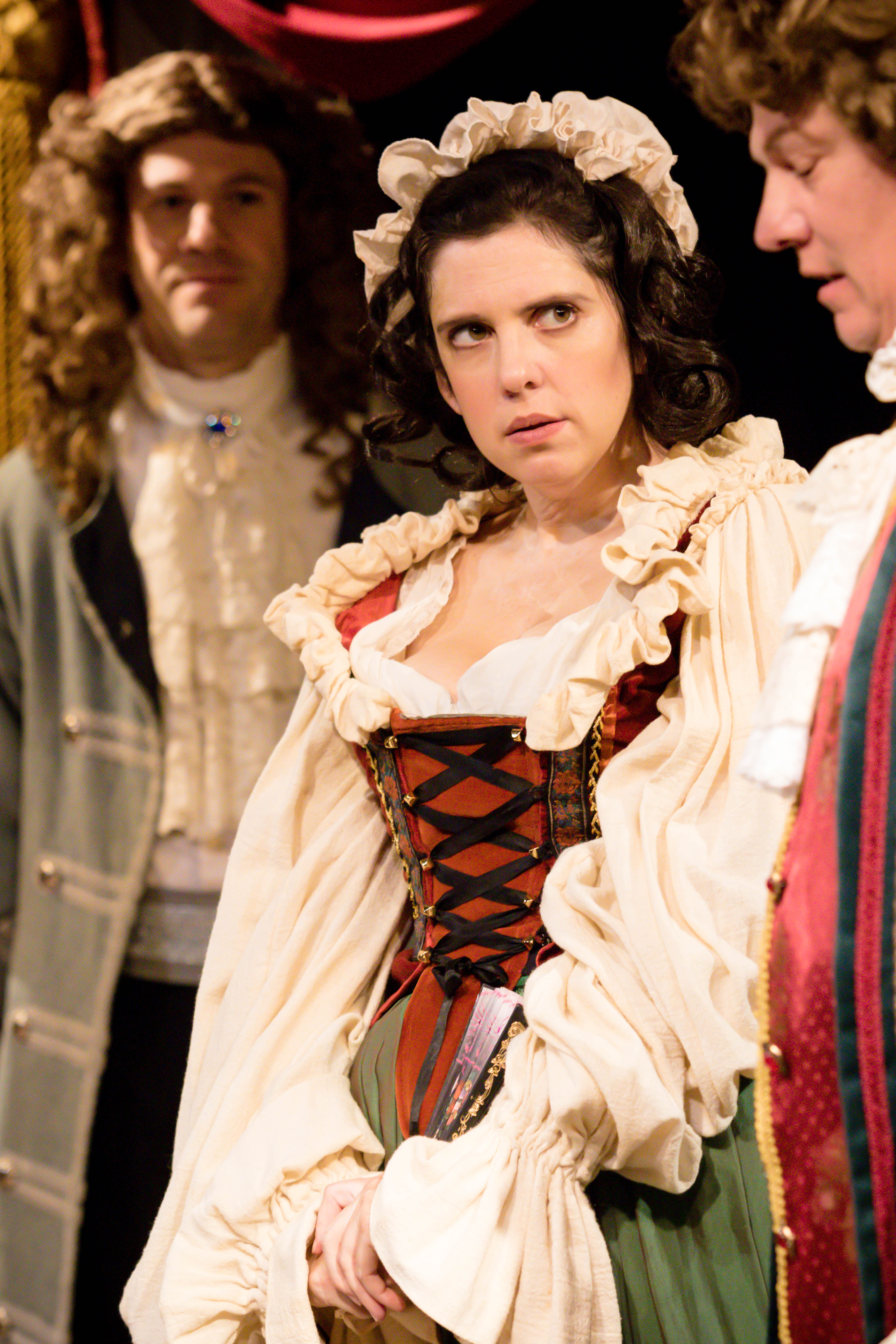 Arlington, the King’s loyal courtier, played by Marcus Ezekiel, could have been more sinister and then his punishment, namely having to walk the dogs, would have made more of an impact. A delightful cameo performance was given by Illeana Falcone who plays Queen Catherine. Although one couldn’t understand a word of what she was saying, it really didn’t matter as her facial expressions said it all. Doubling up can be difficult but Juliette Sexton in her roles of Lady Castlemaine and Louise De Keroualle manages this well. The scorned mistress scene was especially effective. Nancy, the reluctant actress, played by Rachel Burham displayed excellent timing skills.