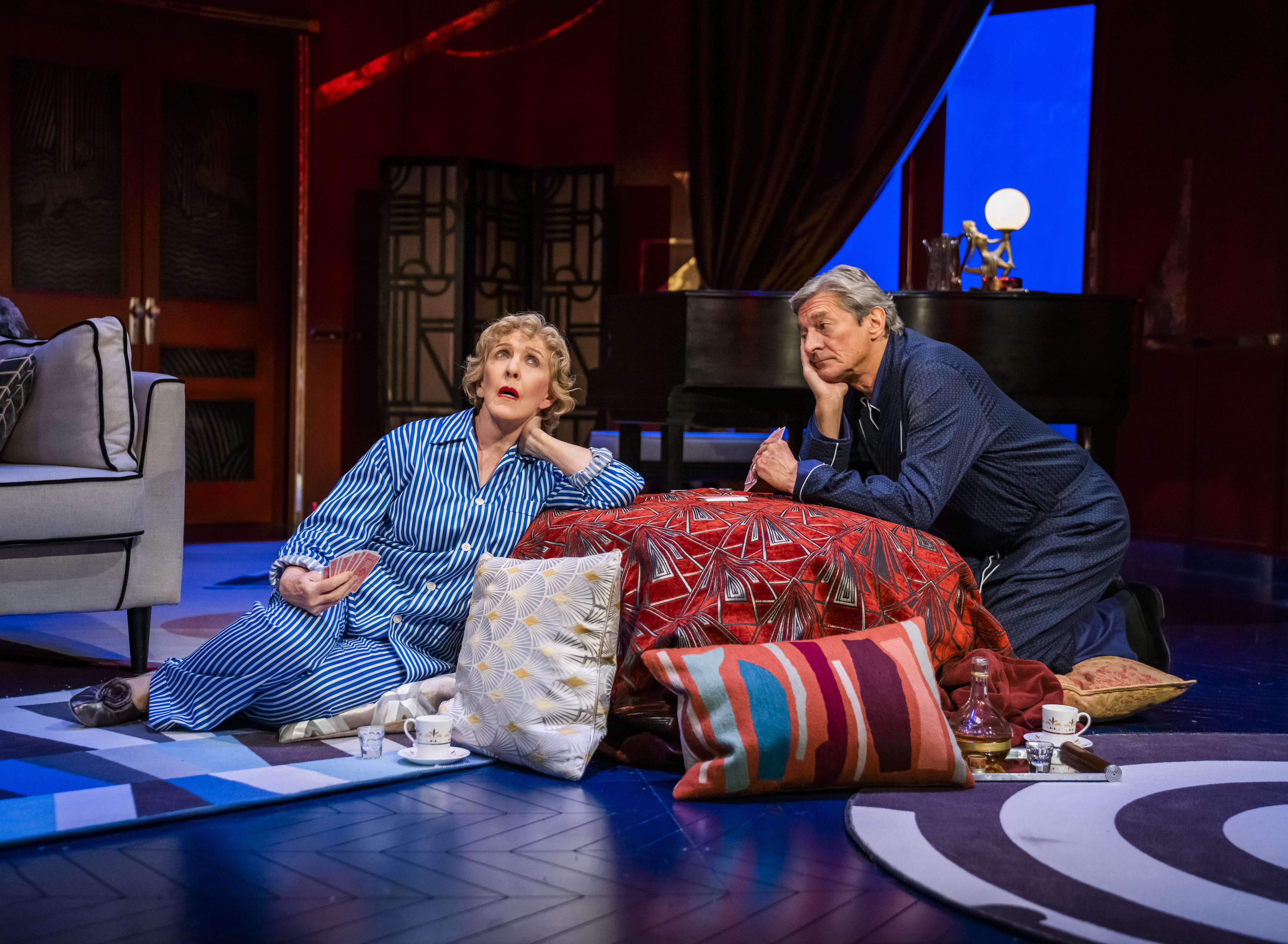 Simon Higlett’s set and wardrobe are simply perfect. If the Deauville hotel façade was an impressive set for the first act, as soon as the action moves to Paris after the interval, the sumptuous art deco confection that is Amanda’s Paris flat provokes audible gasps from the audience. Decorated liberally with cushions, and huge curtains, the reunited lovers sprawl languidly over the furniture, drinking brandy, playing cards, in comfortable but clearly luxurious pyjamas and dressing gowns. As they discuss the simple joy of staying indoors for several nights, it’s impossible not to draw a parallel with the events of the last couple of years where many of us have been spending time indoors, but seldom in such wonderfully-designed loungewear.