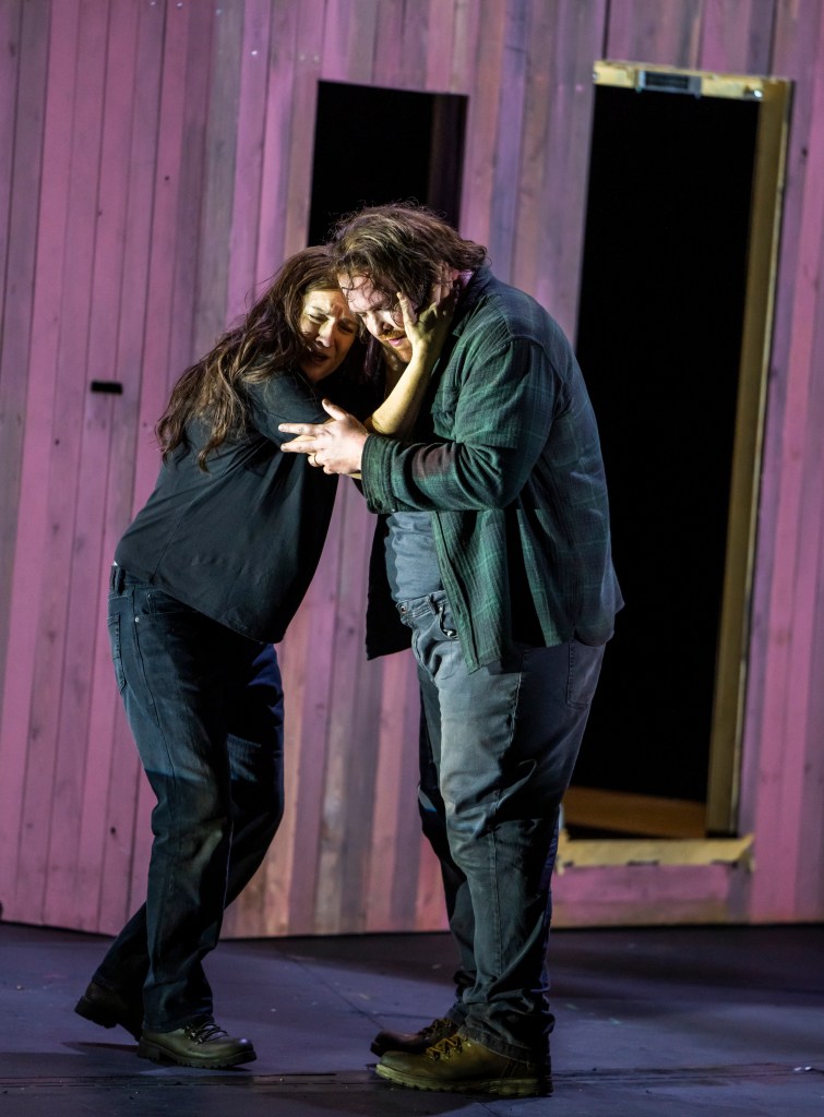 The tone is also at odds with the sturdy, outdoor aesthetic of our ill-fated protagonists, with their sensible boots, jeans and tees, and the woodshop vibe of Sieglinde and Hunding’s marital home. I say ‘woodshop’, and in fact a huge ash tree grows in the middle of the self-assembly hut and right through the exposed rafters. It’s one way to juxtapose the domestic and mythic aspects of the opera, I suppose; but if this is a show home then I’m not buying.