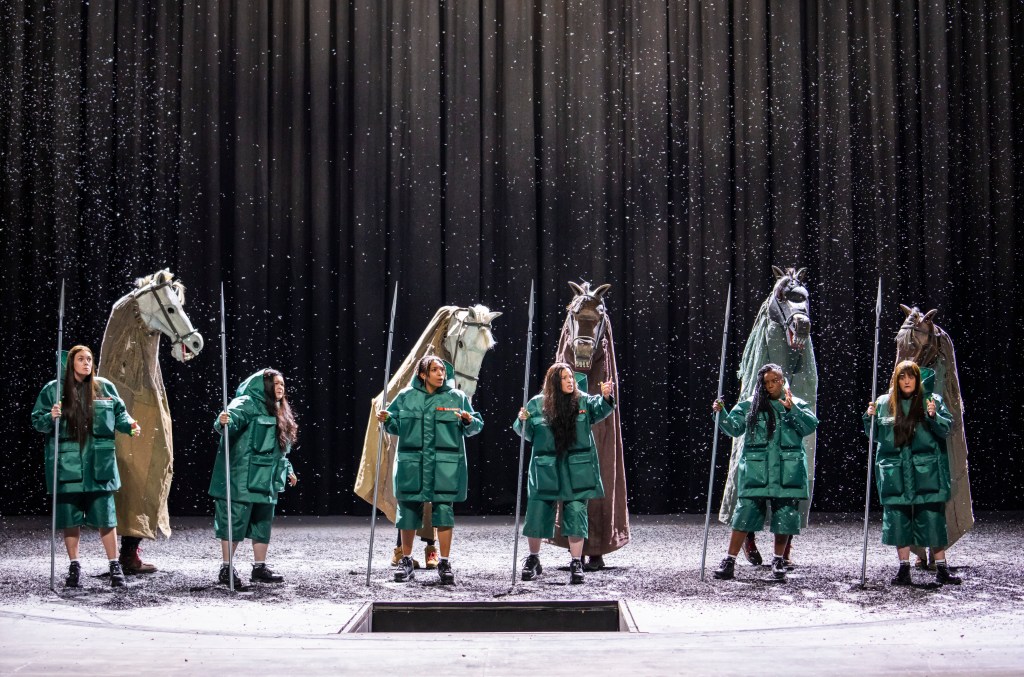 At least that is clearer with Brünnhilde’s sisters. While the titular Valkyrie is brightly clad in après-ski athleisure, the others sport sensible puffer jackets in line with the overall outdoorsy aesthetic. This and their generally wholesome air give the impression that they are enthusiastic Girl Guides on an ambitious expedition to the Arctic rather than angels of death. There is a practical care in the way they hook the victims of battle to the Kirby wires, but rather than being hoisted off to Valhalla the dead warriors dangle before us like trainers flung over telephone lines.