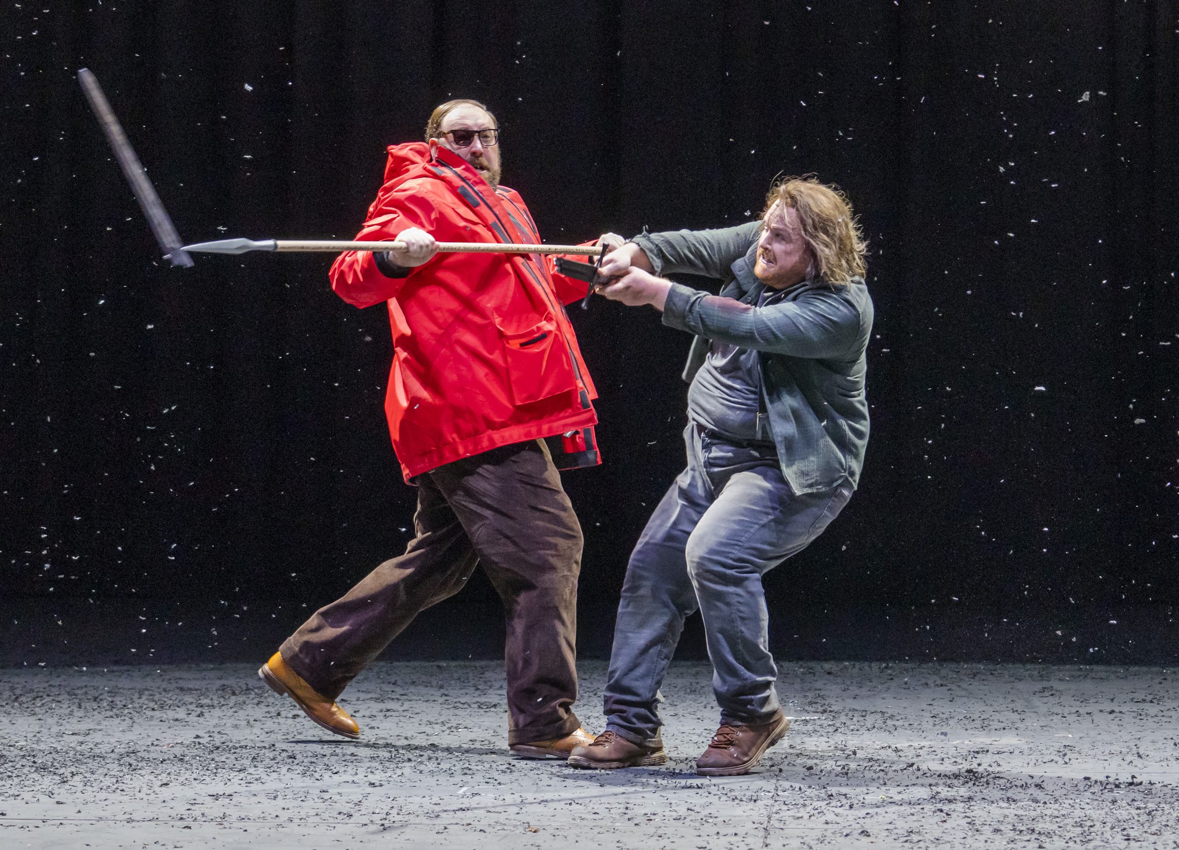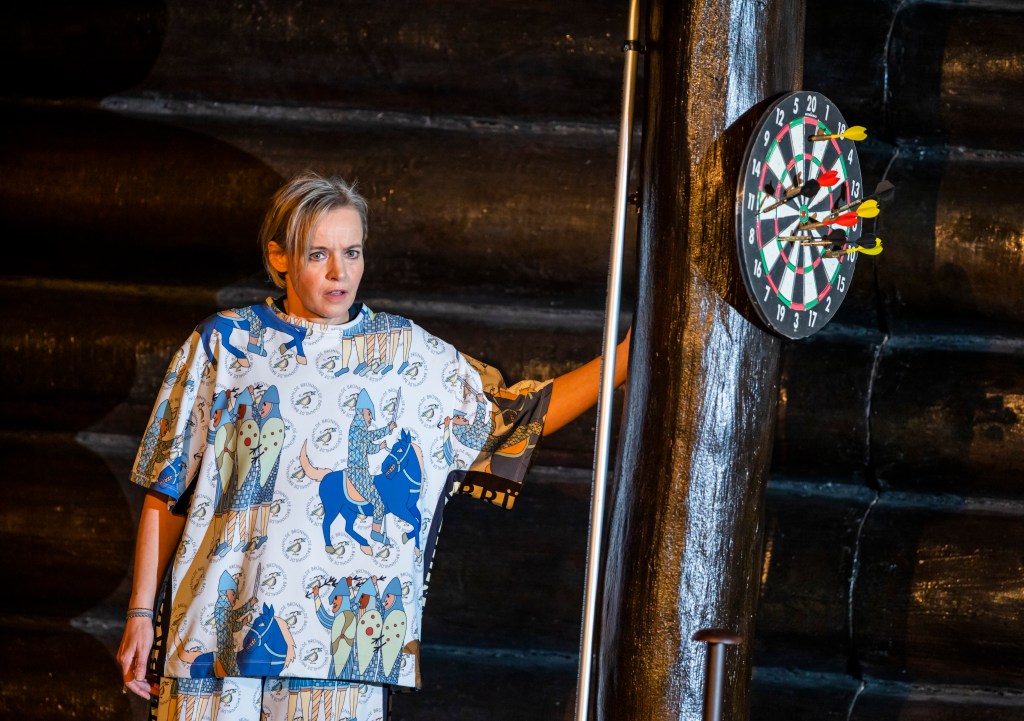 If the first act is bound up with fire and water, the second is a breath of fresh air. When we first see Brünnhilde she is bouncing on a sofa in a ski lodge playing darts, showcasing performer Rachel Nicholls’ gleeful charisma. Meanwhile Matthew Rose in Helly Hansen as dad-god Wotan is reliably commanding, even when the Valkyrie mischievously, if problematically, straddles her old man to play horsey. (At least he’s a more convincing steed than those Brünnhilde and her sisters have later, which loiter like pantomime attempts at chesspiece knights.)