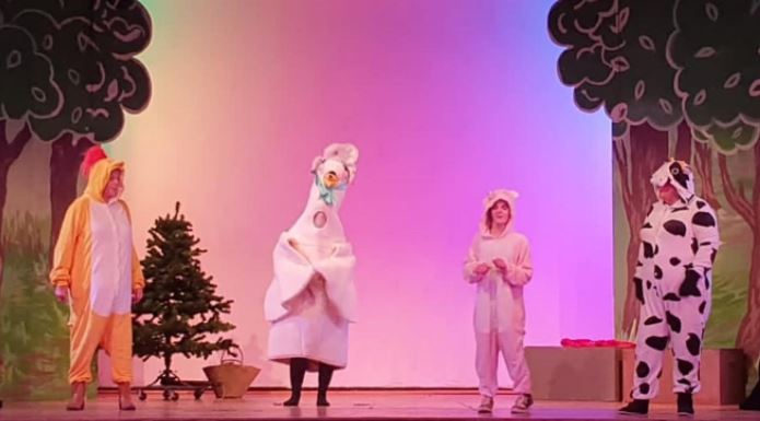 A cold winter’s night is rife for a warm welcome at a pantomime, (oh no, it isn’t!), and the introductory humorous couplets between good and evil did just that. The boldly-robed evil Priti Snyde and good-hearted, ultra-pink Fair-Enough-Ski involved us in participation as soon as the curtain went up. Their rapport was tangible and played with traditional gusto by Annie Collenette and Roger Hayward-Smith.