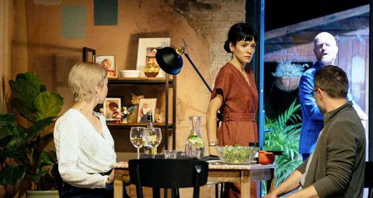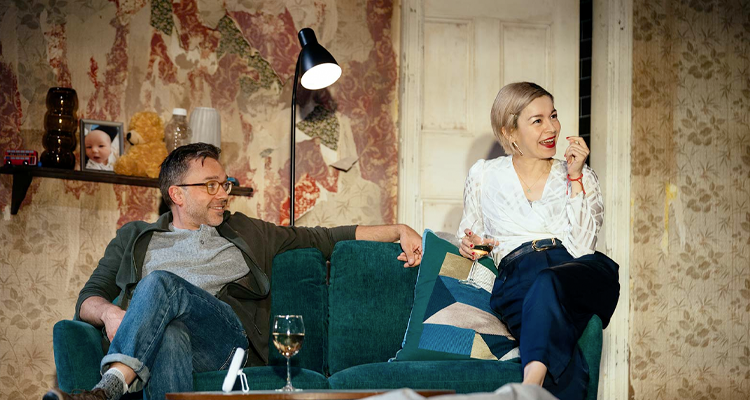 Giovanna Fletcher as Jenny was convincing as a tired and brittle new mother, but became so shrill in places that we could not pick up her vital dialogue.  James Buckley, a builder boyfriend of guest, Lauren, became the self-appointed ghost-whisperer, nursing a grudge against the middle classes, and Elliot Cowan as Sam, Jenny’s partner, was over superior.  Stephanie Beatriz, who played Lauren and whom I adored in In The Heights, unfortunately came over as dull and badly needed to project. The subtext and tension between the foursome, however, was tangible.