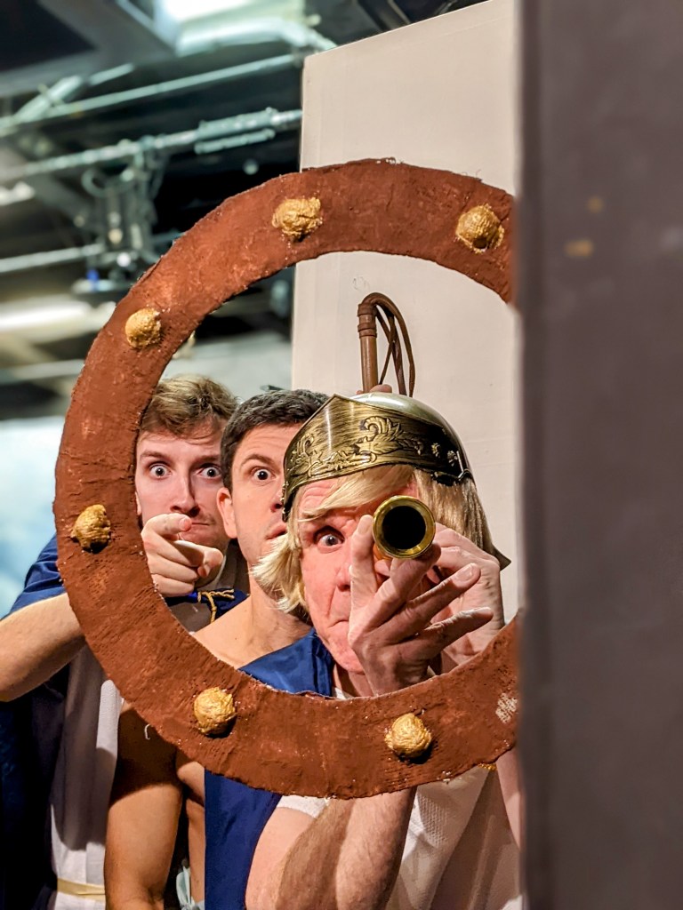 All the technical elements were achieved with a suitably minimalist approach, giving the impression that this is a production that could be packed into the back of a van at the end of a run, ready for the next location. Scenery consisted of a painted backdrop flanked upstage by two trucks holding flats which could be quickly revolved to provide interior or exterior settings. Oh, and a porthole, handheld from the wing. Don’t ask, but it worked. Straightforward, unfussy, and entirely suitable for maintaining the pace of the piece. Similarly, props, often seemingly straight out of the basket, but just enough to support the gag. Lighting again was uncomplicated, making use of appropriate colour washes and included in the gags by means of occasional miscueing – scripted, of course! Sound was clear and sound effects well placed and audible. Lastly, but by no means least, the costumes. Using a sort of shift as a base (I’m not a costumier, as you can probably tell), other drapes or wraps could be quickly added or removed to create character. Well thought out and effective in the execution.