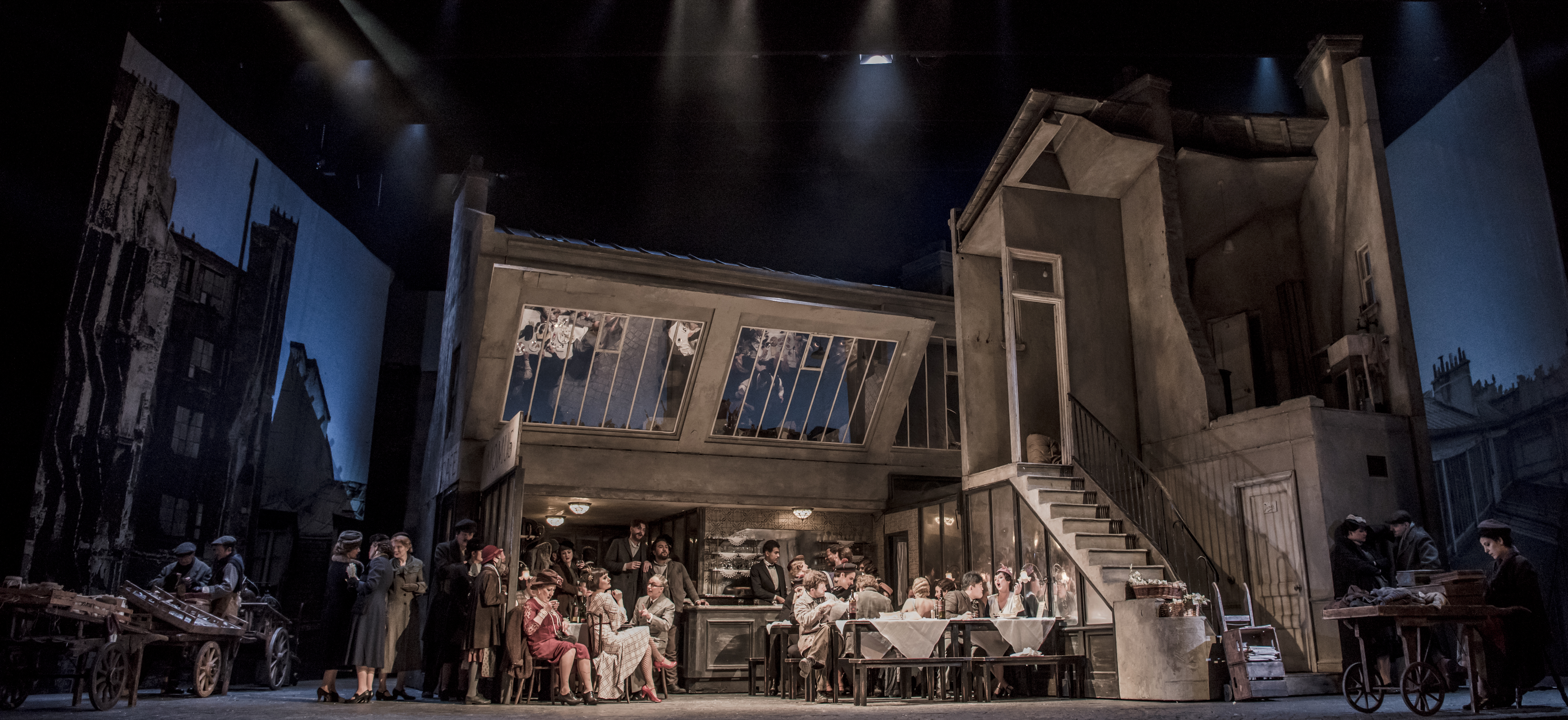 The emotional registers turn as swiftly and smoothly as Isabella Bywater’s impressive recreation of the Parisian demi-monde. The production’s admirable attention to detail is marked not only in the set design, and in Jean Kalman’s appropriately seasonal lighting, but in the activity and bustle of the metropolitan crowds. These are not drilled troupes but characterful individuals, from the waiters anxiously juggling crockery to the suitors of the blowsy Musetta (Louise Alder) who draw the temperamental Marcello (Charles Rice) into fisticuffs. The background activity gives the production an affable comic realism that more than counterpoints the tragic narrative.