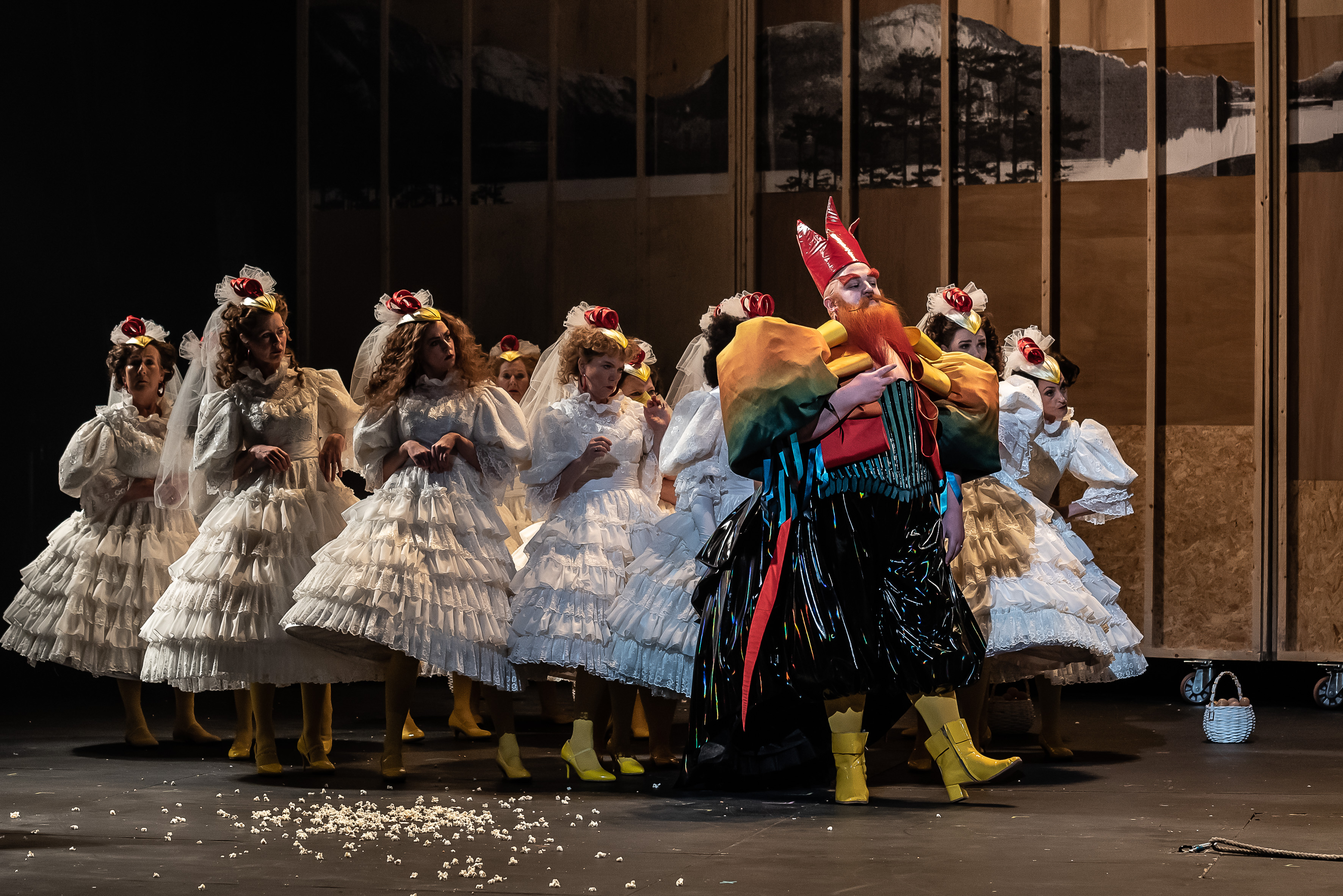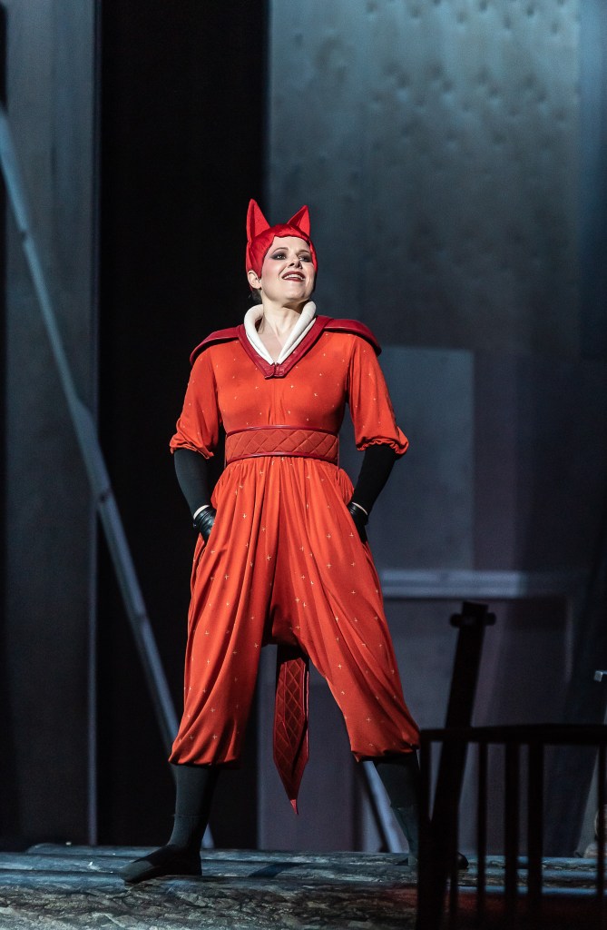 The human world and the woods are shown in striking contrast, as the human characters are clothed in drably monochrome costumes, while the animals come alive in vibrant creations from designer Tom Scutt. Soprano Sally Matthews wears the most distinctive costume as Vixen, and she plays the part with great physicality, swaggering and bounding over the stage. But the biggest audience reaction is reserved for John Findon’s flamboyant Rooster, and his retinue of Hens.