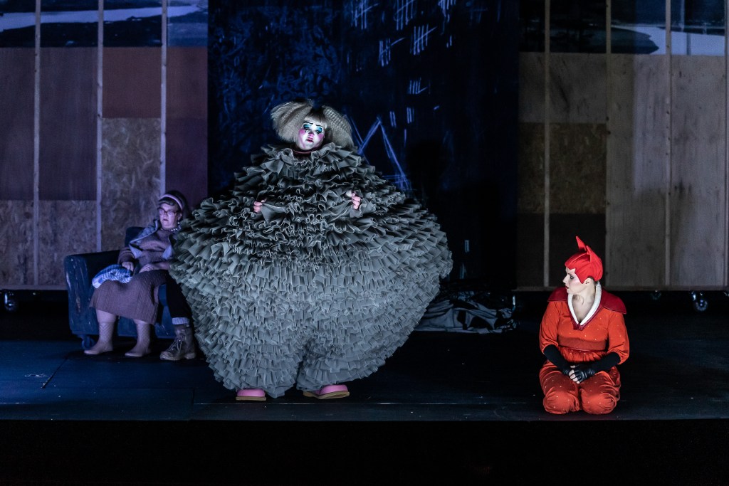 Directed with flair by Jamie Manton, the opera is staged with movable wooden flats, piles of logs, and an endlessly unfurling illustrated banner that unrolls on the stage throughout the performance. The combination of Anya Allin’s illustrations with David Allen’s flexible set design, along with evocative lighting design from Lucy Carter and Gabriel Finn, creates a constantly shifting world through which the characters move.