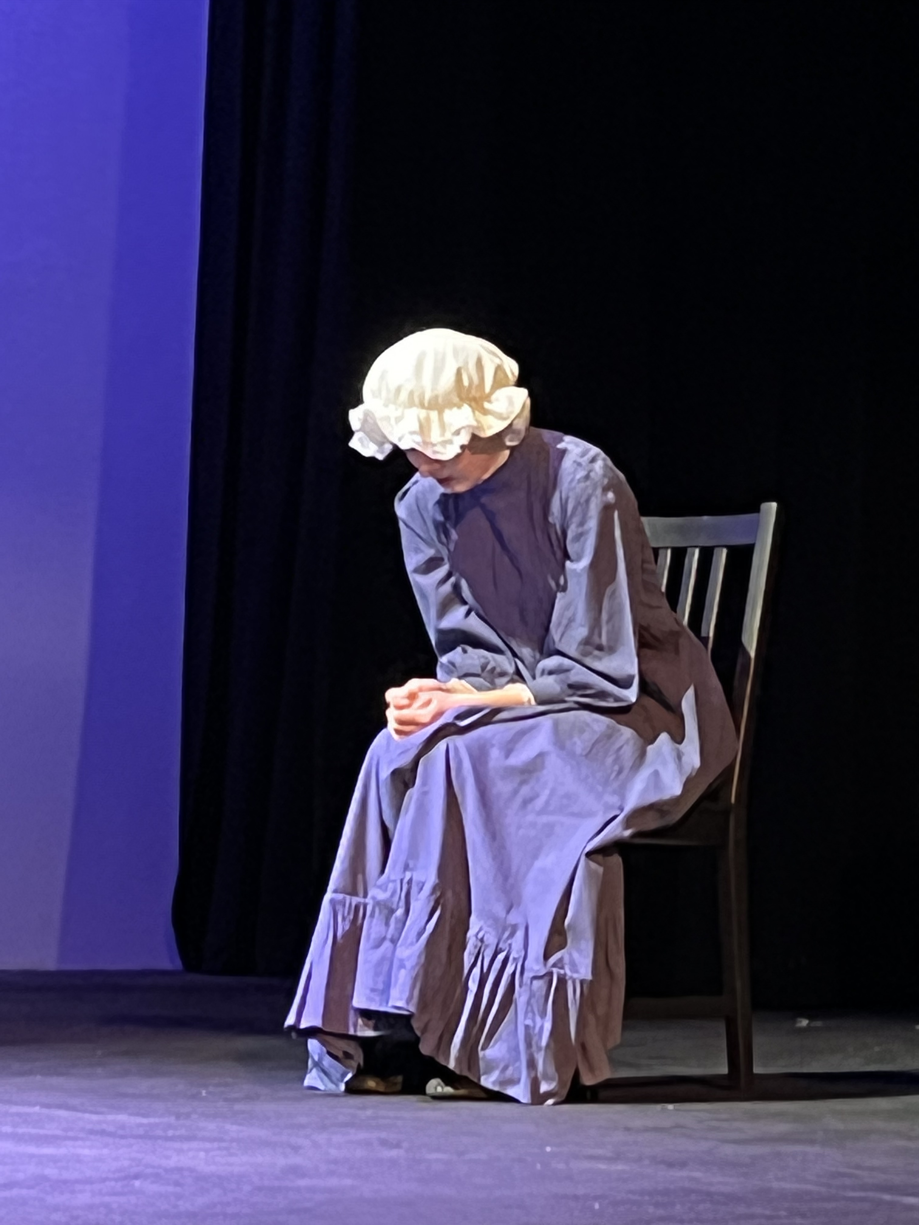 We sat down to a curtain-less set, with a pensive blue backdrop, that was simple yet effective. The dramatic lighting by Ken Lau, and the sleek direction by Emma Louise Tinniswood brought this dark, vibrant piece alive, with predominately white costumes whose simplicity matched the mood of this grim era. Each scene was striking in its own way with tableaux from talented young actors from Step on Stage Performing Arts.