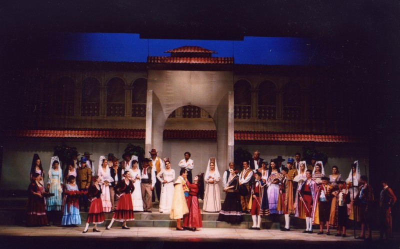 This production is relatively simple – one unchanging set – a broadly classical square that might be found in any southern Mediterranean country – with a few additional touches to represent the square, the tavern, the bull-ring and the smugglers hideout in the mountains. I wasn’t entirely sure about this set – it was a bit oppressive and it seemed to limit the performing space both in the expanse of great Spanish cuadrados and the mountain haunts of the smugglers, and I think this constrained the atmosphere somewhat. But I understand this simplicity, given that this is a touring production, playing often one night at a time throughout the whole of the UK in six months from January to May of this year. But the costumes make up for this, being bright and lively.