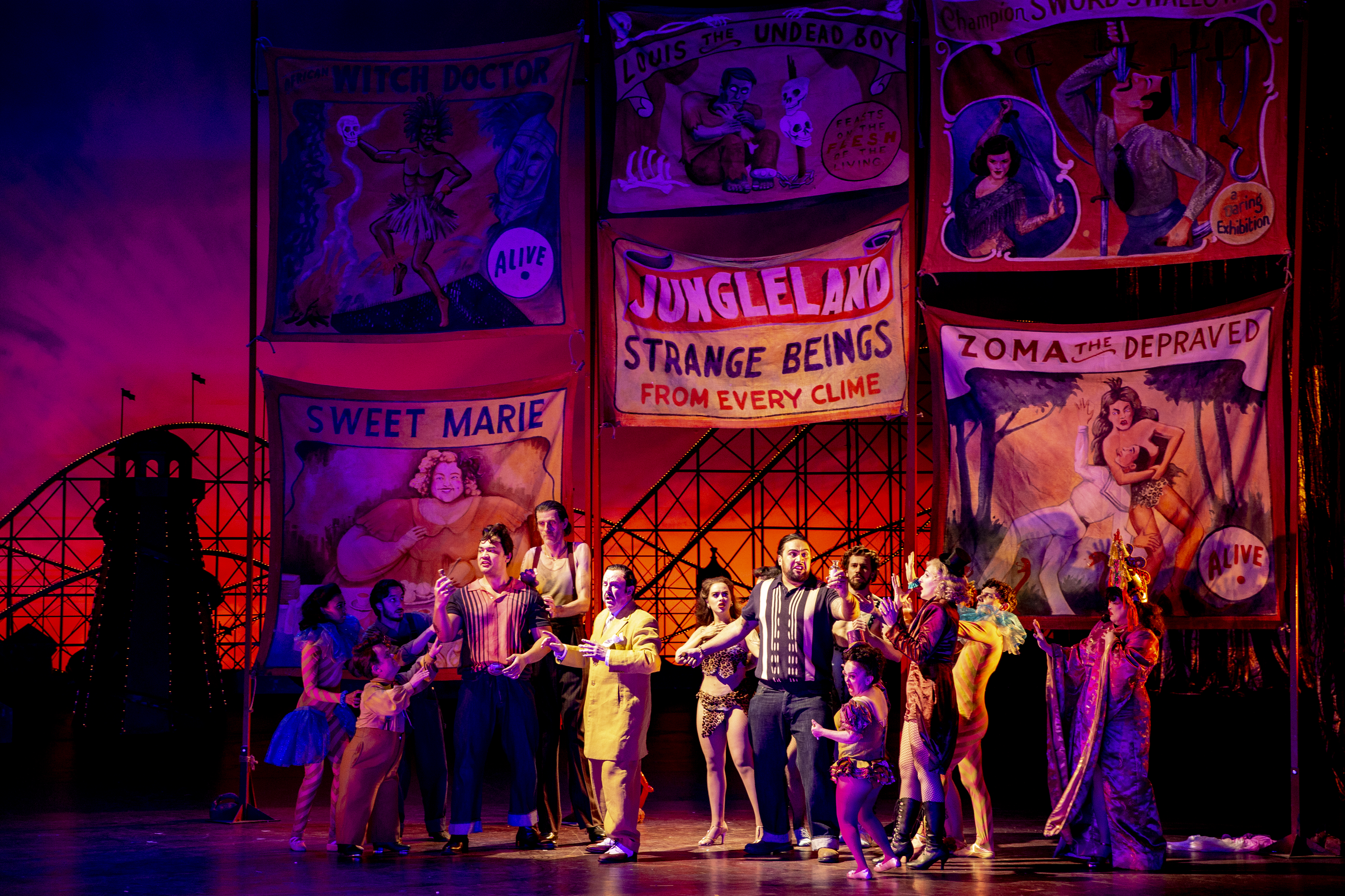 As the carnivalesque ensemble melt into the background of a bar in a faded recreation of 1950s Coney Island, Don Alfonso begins to harangue his two young friends Guglielmo and Ferrando about the essential duplicity of women.