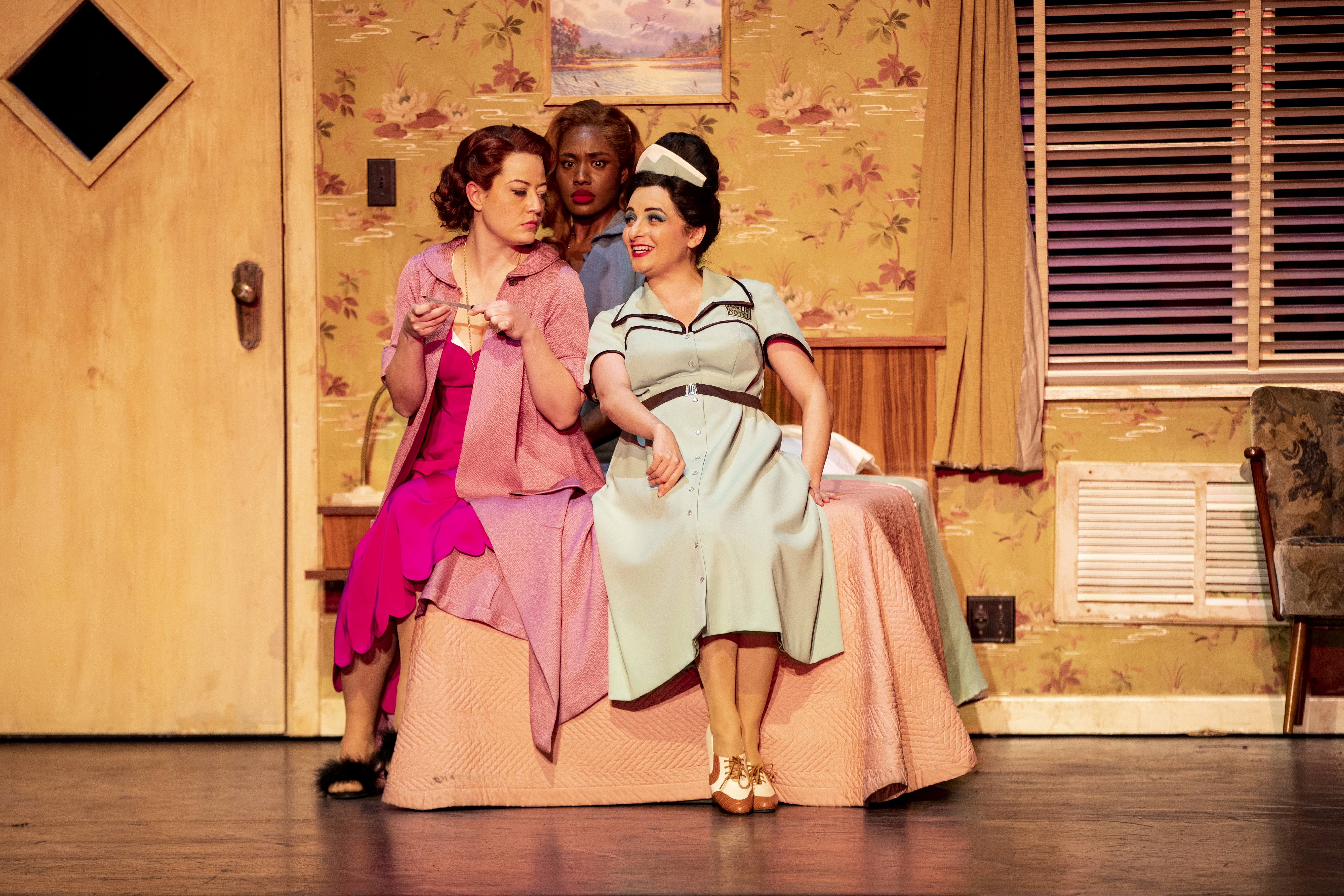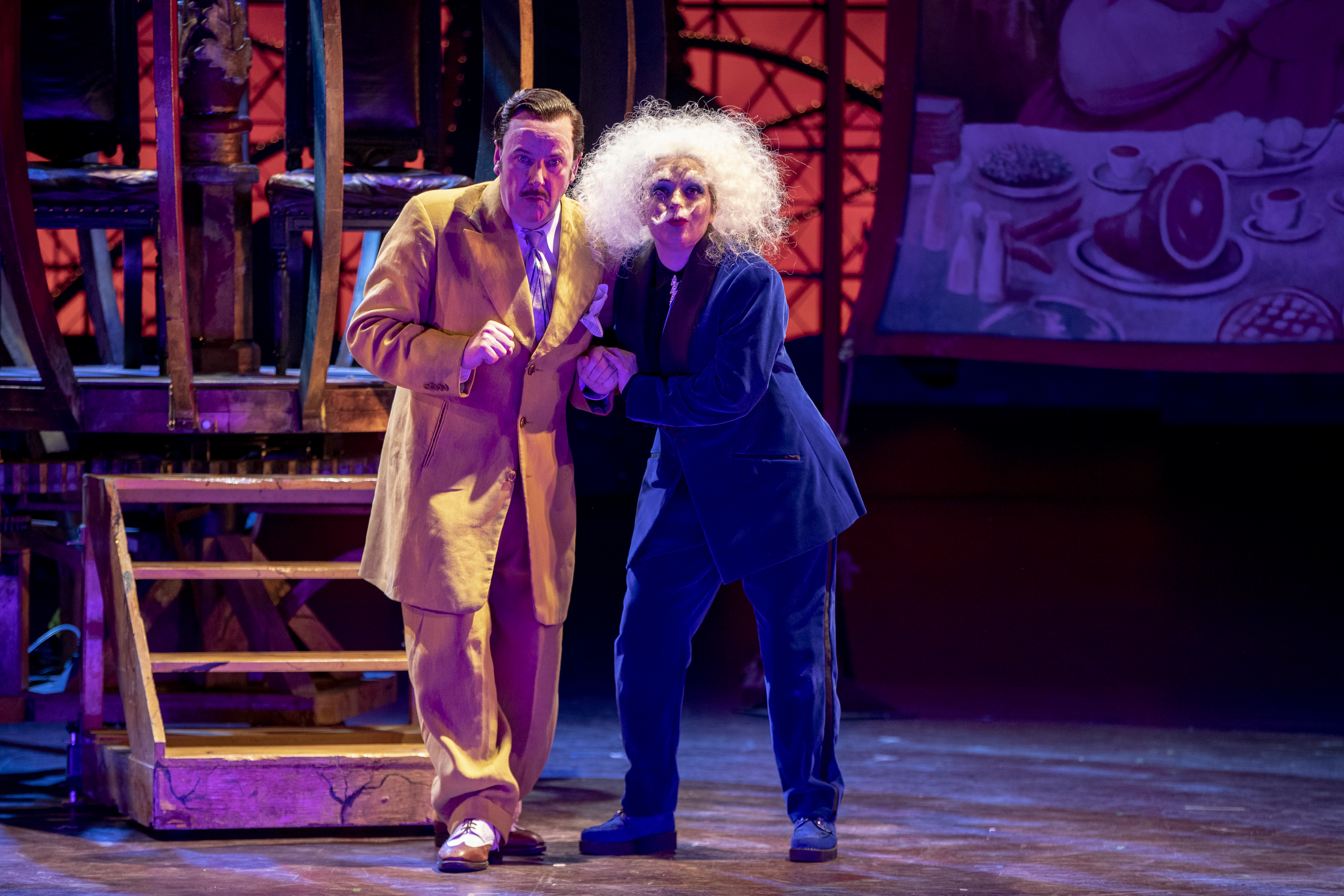 Ferrando and Guglielmo disguise themselves as suitors, and attempt to woo their fiancées, having given Don Alfonso their word as officers that they won’t give the game away. Benson and Pati both look as though they’re having much more fun in disguise, as swaggering cocksure peacocks wearing ridiculous jackets. (The colourful costumes by Laura Hopkins are a constant joy). The lovers spend much of the rest of the first act chasing each other between the three motel rooms and it’s all gloriously well-choreographed fun.