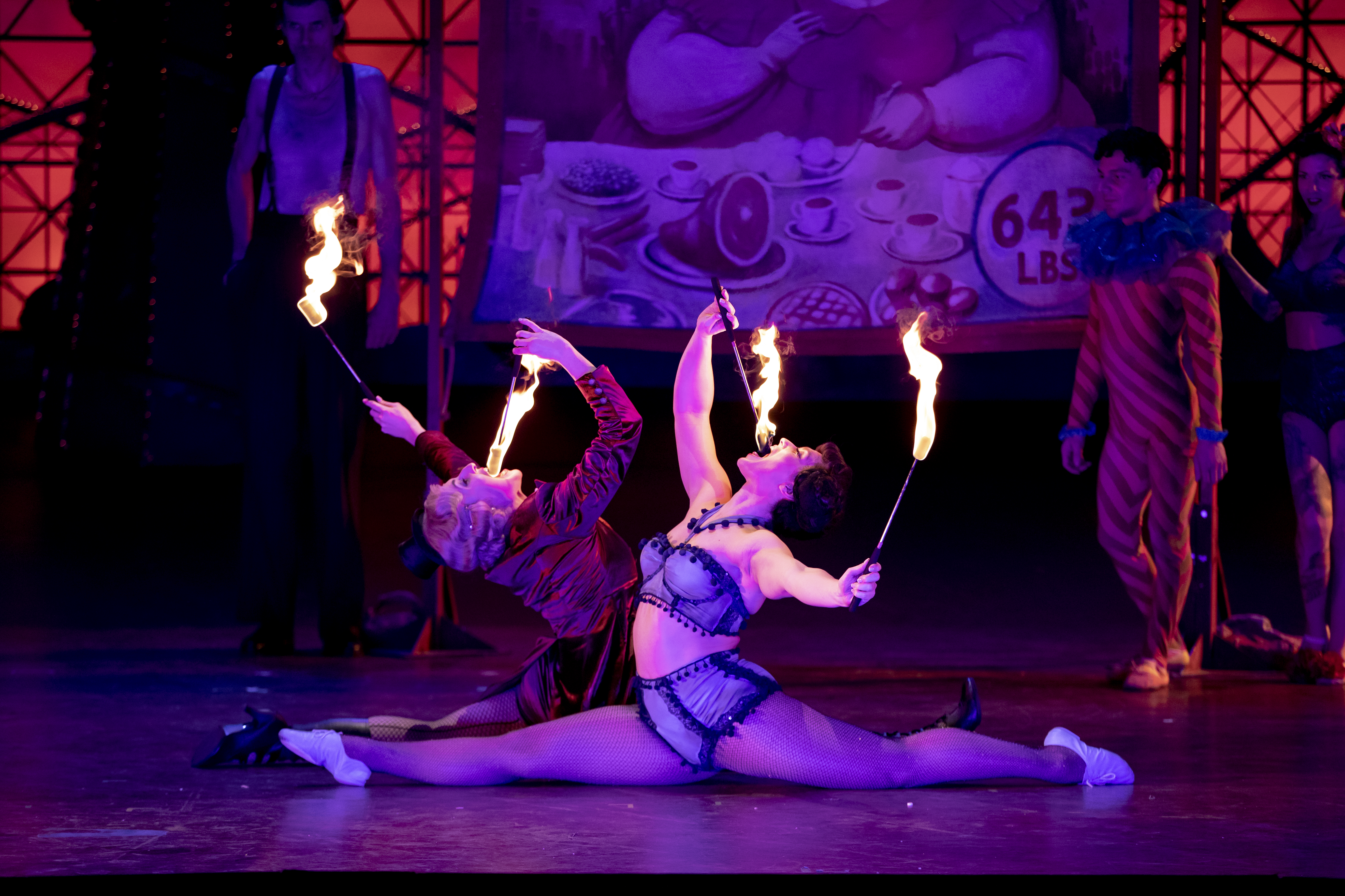 This revival of director Phelim McDermott’s 2014 production of Mozart’s comic opera begins with a flourish that sets a playful tone for the evening, as the skills ensemble of sword swallowers, contortionists, fire-eaters, and acrobats take turns to climb from Don Alfonso’s surprisingly capacious trunk onto the Coliseum’s forestage.