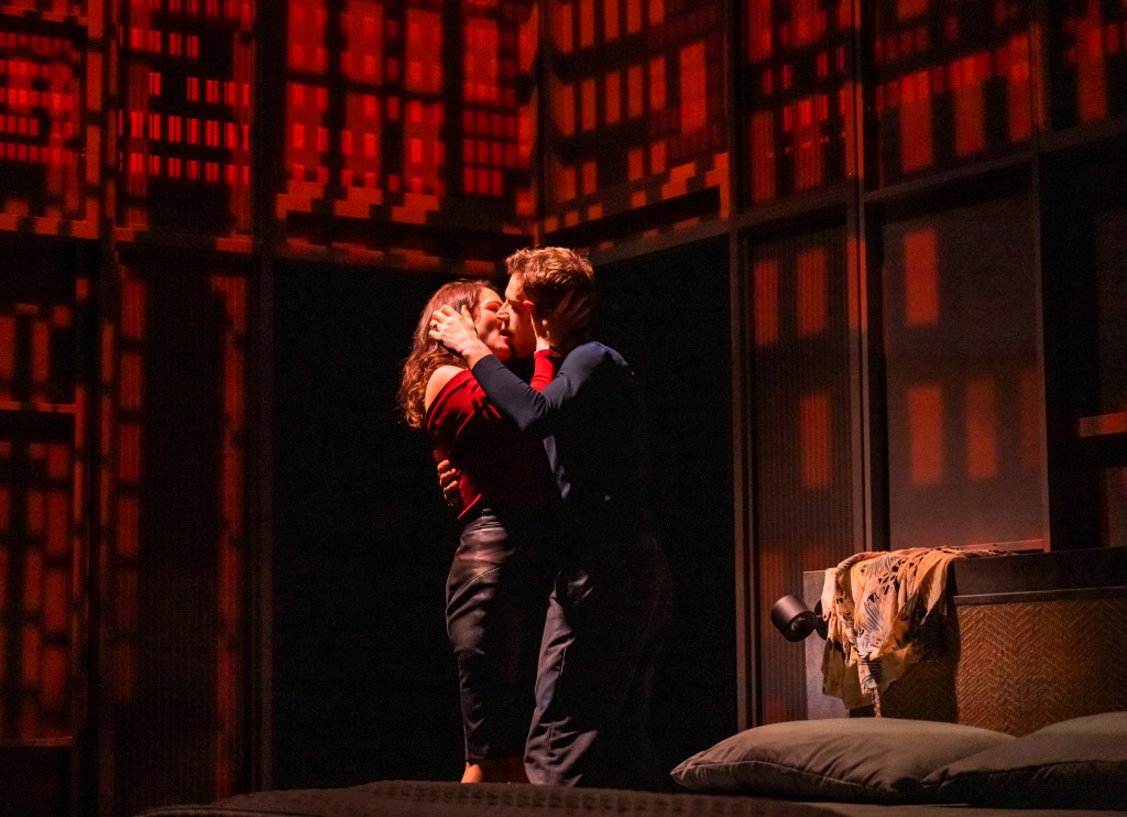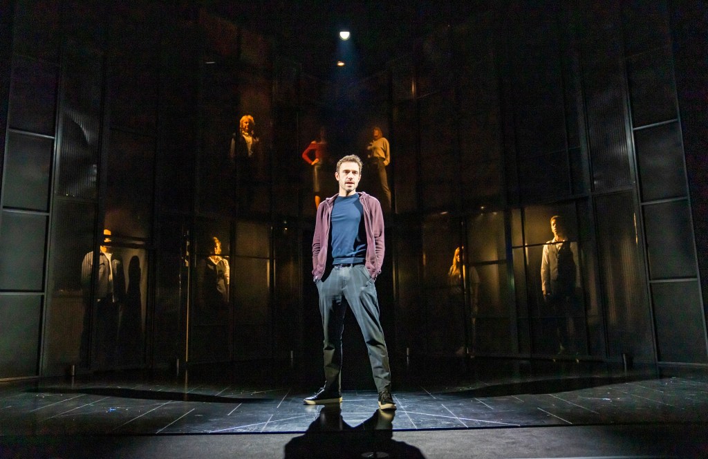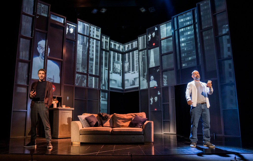 There were clunky bits: every time a male character sat anywhere on stage his ‘manspreading’ knees were at 180°, trouser seams straining; Alex’s wardrobe was strangely drab, and the Cluedo-style prop in one of the final scenes a tad cringeworthy but the production nevertheless works; it’s still engaging, thrilling and clever. This has a lot to do with set, lighting and sound. Morgan Large’s set was a huge floor-to-ceiling backdrop of rectangles curving around the back of the stage, almost giving a sense of ‘little lives, rounded’, though these lives are “made on” nightmares rather than dreams. Onto the backdrop are projected the moving walls of an upmarket bar, the office with Manhattan skyline out of the windows, the country house, or various video calls and texts. It was lit atmospherically, often darkly, by Lighting Designer Jack Knowles and complemented by Sound Designer Carolyn Downing’s effective soundtrack which increased the sense of urgency and ramped up the tension.