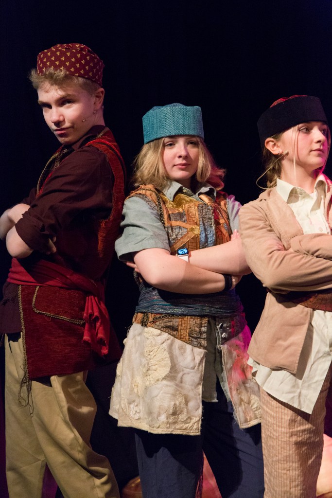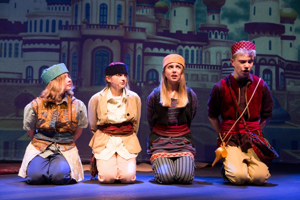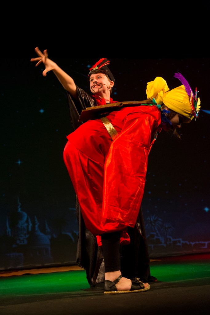 The Red Cast featured the highly watchable Jamie Brinsden as Aladdin and the vibrant Charlotte Azurdia-Latter as Princess Jasmine. Together with the sharp and witty Genie, Scarlett Simpson, this production exuded an array of energy and colour. Aladdin’s supporting pals, Babkak, Omar and Kassim all had a good rapport and stage presence, which shone through with just the right amount of humour. The supporting cast were of a high standard, and mentions should be made to Jafar, the baddie, played by Elliot Wilson and his wisecracking sidekick Iago, beautifully portrayed by Elizabeth Biesty. However, the whole cast should be commended for their full commitment and high performing standards.