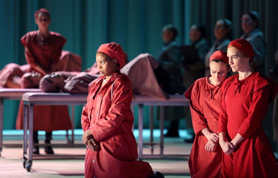 The Handmaid’s Tale is directed by ENO’s new Artistic Director Annilese Miskimmon, whose vision of this bleak setting is efficiently executed by her all-female creative team. Designer Annemarie Woods’ economical set provides an open stage, and there is lots of stylised movement choreographed in the space, which is surrounded by plain grey drapes. The prescribed social hierarchy in Gilead is reflected in the colour-coding of the women’s costumes, Virgin Mary blue for the Wives, grey for the Aunts, red for the Handmaids, green for the Marthas, that is domestic servants, and so on. However, there is one structural feature in Woods’ set, The Wall, an imposing edifice with photographs of those who have been executed for transgressing the laws of Gilead. In the book, their corpses are exposed on The Wall, rather like a Traitors’ Gate.