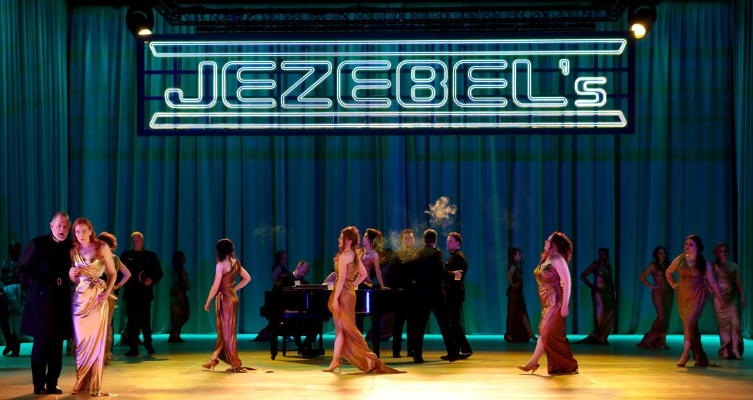 There are many scenes in The Handmaid’s Tale that require great care to pull off without awkwardness or prurience. In this production only some are successful. The lynching of political prisoner by the women on the lie that he is a rapist, and the scene in Jezebel’s, a speakeasy brothel for the corrupt elite, both work. “The Ceremony”, the monthly impregnation ritual, a joyless, soulless and ironically sexless sex-act, awkwardly does. However, the labour ward scene in which all and sundry witness Ofglen’s giving birth, is undermined by the use of flipchart with juvenile drawings. The prayer automat, depicted by childish drawings, where “prayers” can be bought for slot-machine tokens comes across as rather fatuous. Maybe the intention to show the insubstantial nature of the regime. The llibretto has some of these elements. The cod-Latin joke phrase comes over as puerile. Many decades ago, in school Latin, we were presenting “nollite te illegitimus carborundum” as “Don’t let the bastards grind you down”. Come on!