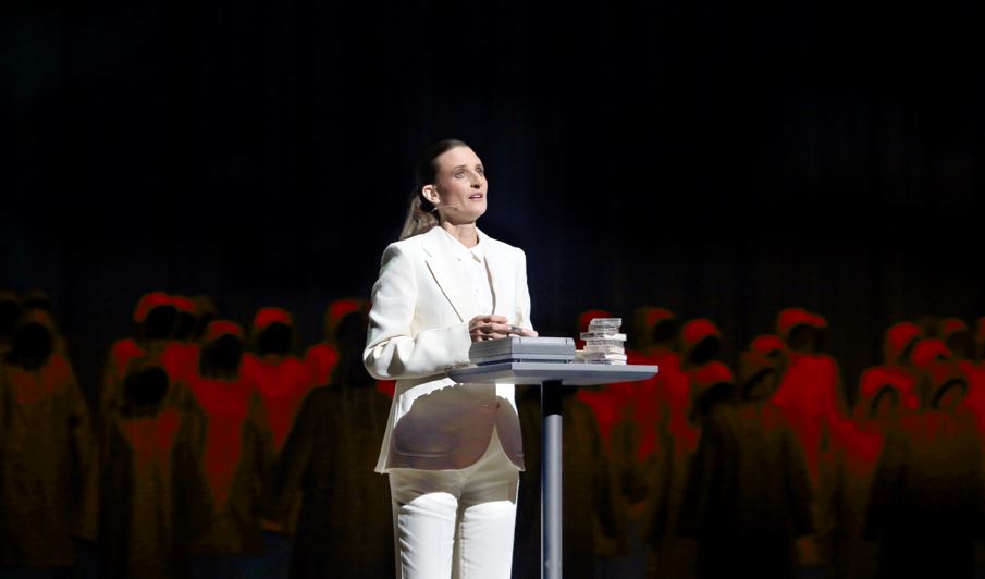 Poul Ruders’ opera follows the harrowing story of Our Handmaid, who becomes Offred after she is assigned to the high ranking Commander, his first name being Frederick. The story is told via the framing device of a lecture given at an international conference in the 22nd Century by a Cambridge history academic Professor Pieixoto, who discovers a long-forgotten stash of audio tapes made by Offred. Renowned French film and TV actress Camille Cottin as Pieixoto appeared a little uncomfortable on stage in this speaking part, in spite of some fine acting, in a back-story exposition that seemed rather redundant. However, it did provide some clues for people, like this critic, who has not read Attwood’s novel.