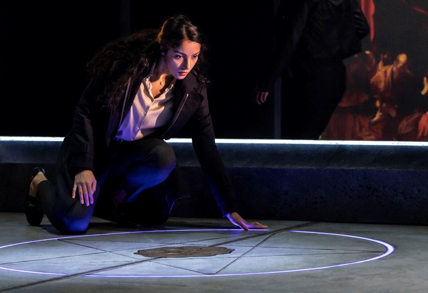 Whatever you might think of the man’s prose, author Dan Brown does have an incredible knack for weaving engaging narratives with twists and turns, using art history, myth and conspiracy theories to keep the reader engaged. If the man should ever decide to build an escape room I would be first in line. This makes The Da Vinci Code an impressively ambitious story to bring to the stage, with its many chases, grand locations and travelling between countries. Director Luke Sheppard and his creative team rise to this challenge and make excellent use of movement and projection to move the story along with a sleek and flexible set that only needed small adjustments to indicate a variety of places. Throughout most of the evening, there is pulsating electronic music reminiscent of a 90s heist movie. It is honestly quite effective in setting the mood, you half expect to see Catherine Zeta-Jones dodging lasers or Tom Cruise hanging from the ceiling as you enter the venue.