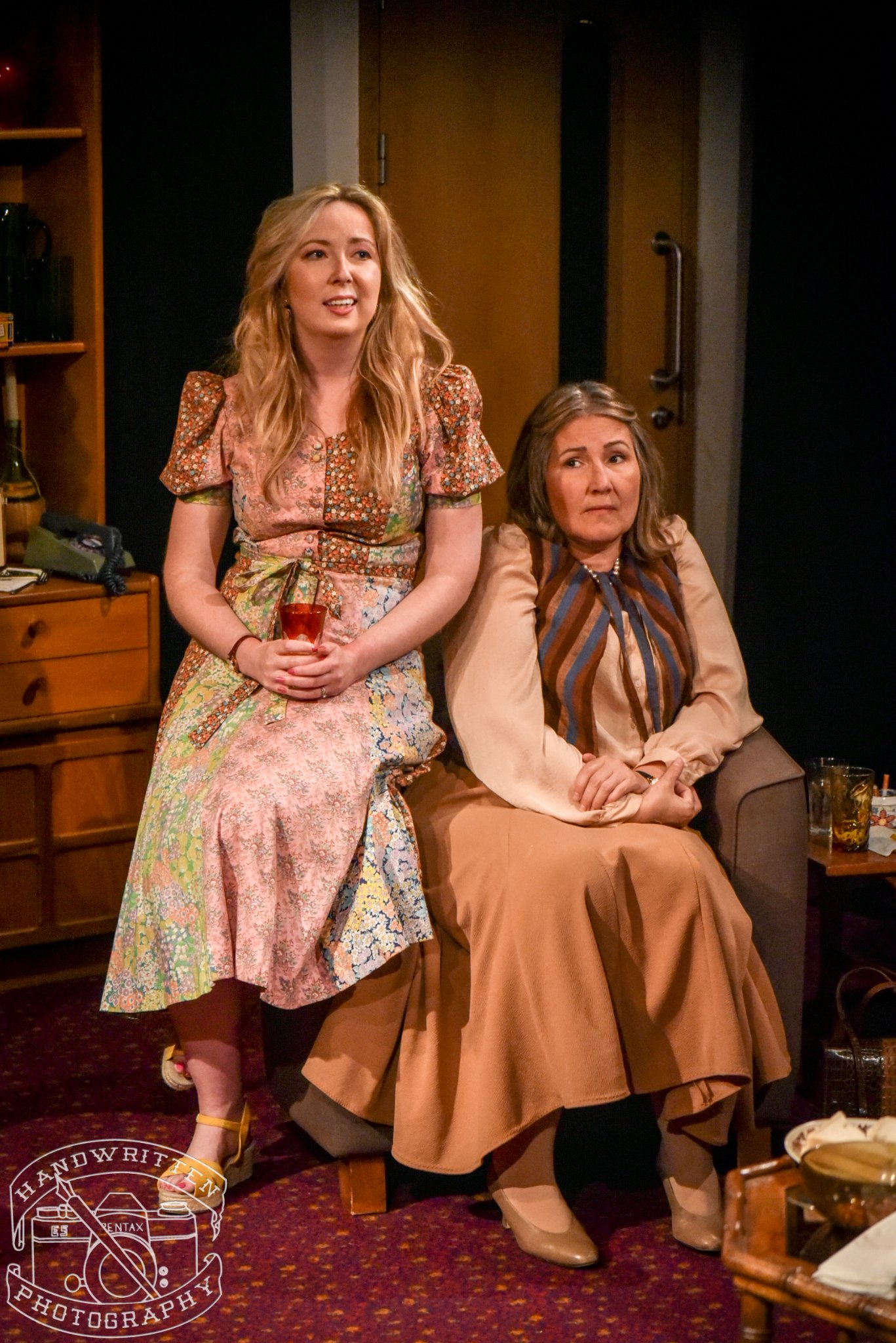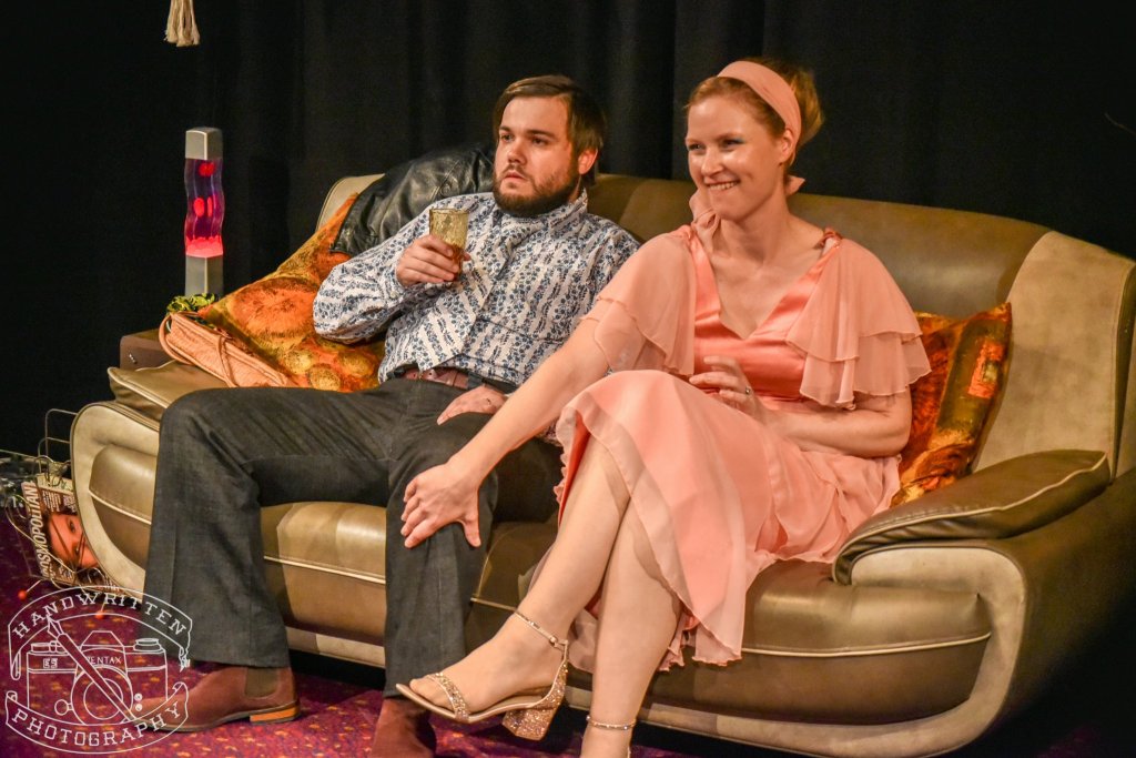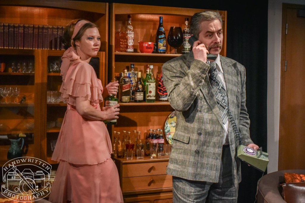 I need not have worried. Set designers Wesley Henderson Roe and Fiona Auty, together with props mistress Jacqui Grebot had conspired to transport their audience back to the 1970’s with excellent attention to detail – from “leather look” sofa to wine bottle candle stick. The space was configured in the traverse, which worked well to bring the audience into the action. Because of this configuration, however only half the audience were able to see Beverly and Laurence’s “kitchen” – the most ingenious use of a fire escape I’ve ever seen. Gary Stevenson’s lighting design was the icing on the design cake; as well as “stage” lighting, ceiling light fittings and the obligatory lava lamp all added to the general ambience. As did the soundscape from Charles Halford, who must have had lots of fun researching the “sound of the 70s” for the pre-show music. Demis Roussos and Jose Feliciano made their obligatory performances, too.