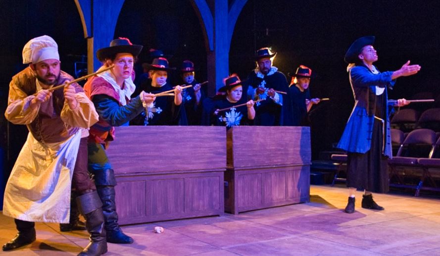 This new production of Glyn Maxwell’s adaptation of the play is performed using traverse staging between two wooden arches. A gaggle of excited nuns set the scene on the way to vespers, wondering where their daily storyteller has got to. Within minutes, the holy sisters are engaging in enthusiastic but decidedly secular swordplay with wooden canes, and selling oranges to each other as they evoke the Parisian theatre where the story begins.