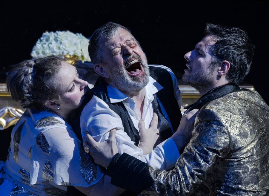 Princess Irene’s entrance has impact, enhanced by her power-dressing: furs, tight leather skirt, animal skin stockings, and Louboutin high-heels with glossy starlet lacquered outsoles. Clearly, the Devil wears Prada. Indeed, all the protagonists’ personality are writ large by their costumes, Hopkins’ designs interpreted in Josie Thomas’ wardrobe realisations. Tamerlano has lamé, bling and attitude. Bajazet is sober white shirt and braces. Andronico is pressed and preppy linen.