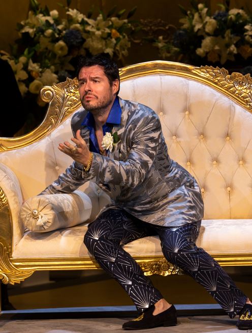 Settings equally speak of personality. Tamerlano’s palace in the tyrant’s own quarters has gilded Louie furniture and more bling, while the walls are expensively polished grey concrete. It is place with ambiguities. What does the courtier Leone do? Seemingly, he runs with the hares and hunts with the hounds, and there are hints of some intimacy with Princess Irene. In the role of Leone, Stuart Orme’s luxuriant bass voice gives welcome counterweight to the musical landscape.