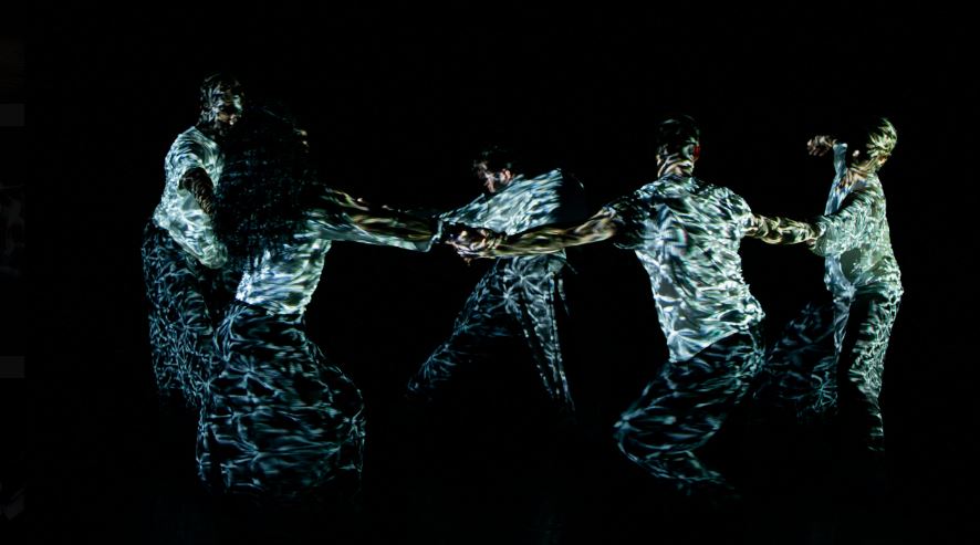 As darkness sets, bodies begin to move in Maliphant’s typically Zen slow motion style. Their minimalist clad silhouettes serve as backdrop for stunning video projections by Panagiotis Tomaras, layering their bodies with a watery pattern that moves like the ripples of a swimming pool. On the simple black box stage, light becomes the main performer. In the semi darkness, individual faces are almost unrecognizable, as anonymous bodies begin a roundelay, bound together by holding hands, the movement of one body impacting another. Everything is liquid, not a sharp movement in sight. Then the dance becomes more rhythmic and animated, as solo dancers emerge from the group.