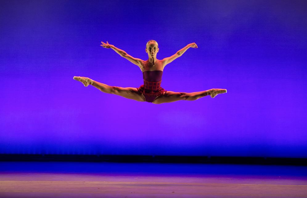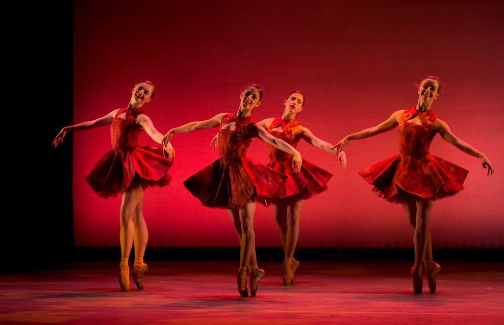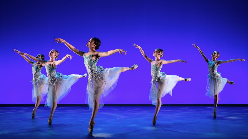 Some passages are more representational, such as allegro movements in L’autunno with four ballerinas en pointe in autumnal mature reds; or the snow beginning to fall in L’inverno, white gauziness against an icy blue cyc as winter is coming.