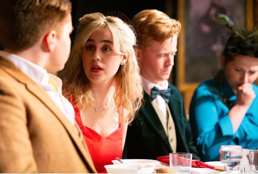 Olivia Meades plays Yvette the Maid, and her French accent couldn’t help reminding me of her namesake in BBC sitcom ‘Allo ‘Allo! Her cheery demeanour is immediately contrasted with Bonny Ward’s dour Cook. As each character enters, subtly dressed in their appropriate colour by Sarah Dowd, Liz Lattimore and Emily Moss’s wardrobe team, they get a few moments to act as suspiciously as possible, and the audience gets a first sample of their American accents.