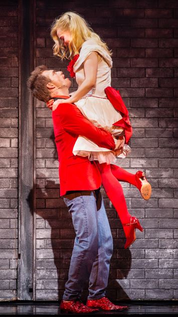 The set is a fantastic confection from designer Sara Perks, the forbidding scaffold brightly lit by Chris Davey’s lighting, and then dressed with bright pink sofas made to look like the back of a Cadillac, or school lockers that swivel to reveal the gym’s showers. With scenery flying in or sliding across the stage, Footloose is an extremely slick exercise in stage management.