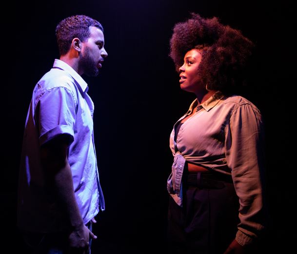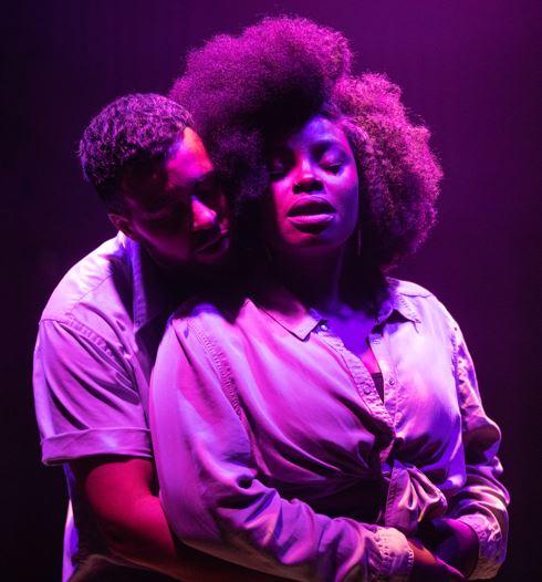 Nadine Higgin and Aaron Anthony provide impressive performances, beginning as two happy, optimistic children attracted to each and attaching no importance to skin colour. Both actors become their own characters at all ages, seeming to generate each stage of development from within themselves rather than assuming a role change. Both portray their friends, their own parents and a grandparent with small alterations to voice and demeanour, but with no prop or wardrobe changes to help. Little worlds are evoked: the playground, teenagers discovering sex, a train to New York and then New York itself in all its different guises. There’s a lot of humour. Nadine Higgin in particular makes skilled use of physicality with each character she takes on.
