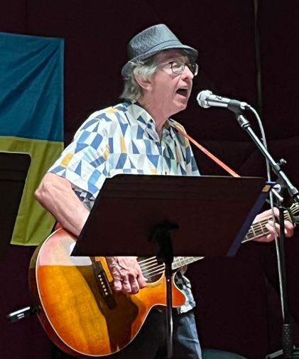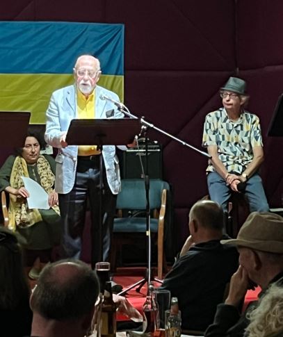 Margaret May read German poet Reiner Kunze’s poem Diebeslied in German, and Graham Harmes read her translation of it, titled Song of the Thieves, “who steal it [Ukraine] without any qualms, / and then all jubilant proclaim / what was your duty to reclaim / cannot be considered stolen.”  The final poem of the evening, Blue on Yellow by Keith Wait, must have been chosen for its power.  After invoking the sunflowers and wheat-fields of Ukraine, now “stunted” or reduced to “shattered stubble”, it ends: “Fly blue for bravery / and yellow now for love.” The evening was rounded off by a couple of Sixties-style protest songs aimed at Putin by Ian Lee-Dolphin.