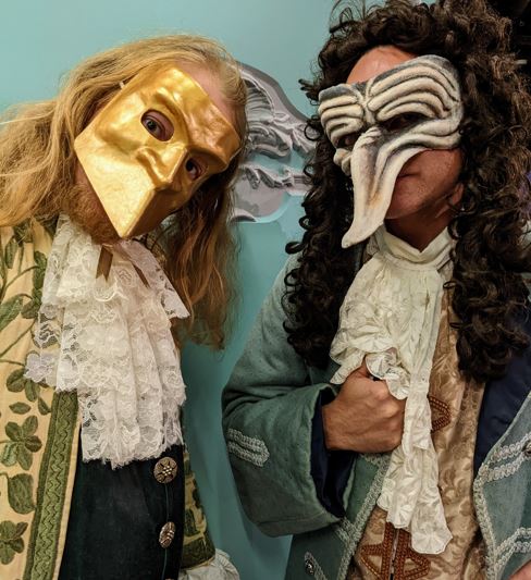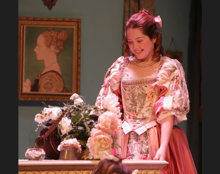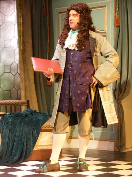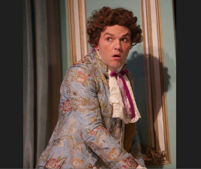 The set, designed by Junis Olmscheid, is lavish, all resplendent rococo gold and duck egg blue, Corinthian columns, chandeliers, tassels and swags. The costumes too are magnificently extravagant as befits the reign of the Sun King. Olmscheid also designed the women’s costumes, Miriam King the men’s, with Irene Read as seamstress.