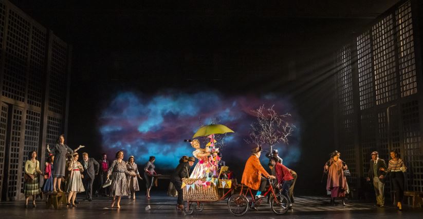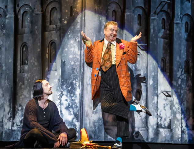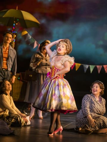 Anthony Ward’s stark stage design is impressive and effective but the neat trick of using the White Tower is kept under wraps until Act Two, which makes the first act somewhat one dimensional. Costumes are equally low key, with post war austerity evident across the colour palette, only brightening a little with the entrance of strolling players Elsie Maynard, dressed in a Columbine-esque 50’s “swing dress” and Jack Point, vaguely reminiscent of Hi De Hi’s Ted Bovis in his ageing Teddy Boy get up. Their entrance is greeted by a group of “youth” who appear to have stepped out of West Side Story.