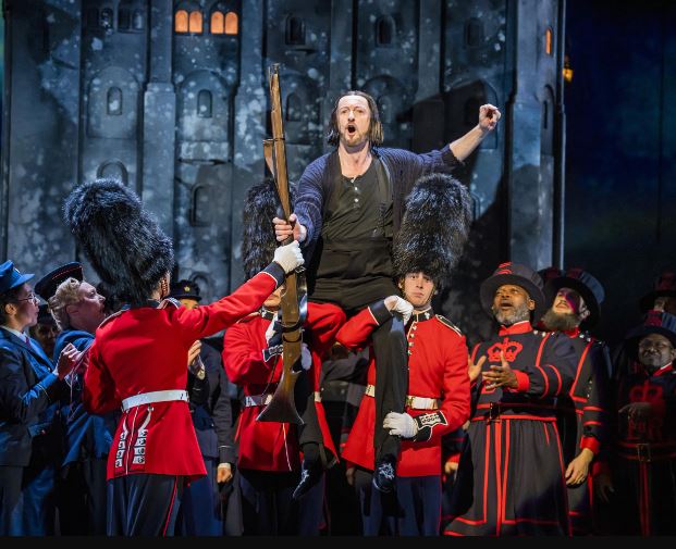 The Yeomen of the Guard is arguably Gilbert and Sullivan’s most dramatic work and almost certainly their most moving. The plot is a little less convoluted than much of their canon and the tale of impending execution, mistaken identity and strolling players (including a motley fool), all set within the walls of the Tower of London is reminiscent of Shakespeare. All of which places it firmly in the 17th century. It is difficult to imagine it staged in any other era. So the ENO’s curtain raising BBC newsreel was greeted with no little excitement and a great deal of hopeful anticipation. However, that excitement was short lived. Director Jo Davies has placed this period piece somewhere in the middle of the 20th century and it does not sit well there.