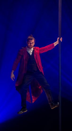 Act Two contains more of the same, as each performer appears with another act, but at no point does it feel tired or boring. Indeed, Tara Boom’s second performance is quite remarkable, and is as contrasting with her awkward popcorn vendor as can be. Now appearing in an elegant two piece suit, she lies on her back and entertains the audience with a show of great precision, skill and balance as she performs a stunning set with four spinning Chinese parasols. Also noteworthy was the reappearance of Desmarais, now wearing more conventional attire, as he performed an incredible aerial duet with Katherine Arnold, to Bon Jovi’s Living on a Prayer. Here the two of them spun so fast that, at one point, it looked like they may fly off into the audience, over whom they swung so perilously.
