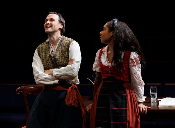 Alex Bhat’s swaggering cavalry officer, Sergius, is masterfully funny – anarchic comedy indeed – yet never going over the top but striking exactly the right balance between comedy and absurd farce. It was a fine, outrageous and mesmerising physical performance. As the male counterbalance to the war hero, Bluntschli is the pragmatic idealist and is very much the mouthpiece for Shaw’s ideals. He also provides the romantic hero and Alex Waldmann’s Bluntschli came across as both believable and sincere in expressing his anti-war sentiments. This was a finely judged piece of acting and his scene in Act One with Raina was touching and engrossing. As for the heroine, Rebecca Collingwood’s Raina was full of well observed facial expressions and reactions and she also captured the transition from the naïve open-eyed girl in Act One to the more knowing and mature young woman aged 23 by Act Three. In a sense, hers is a portrayal of early feminism and explores a character who discovers the strength of knowing her own mind to follow her own passions and instincts.